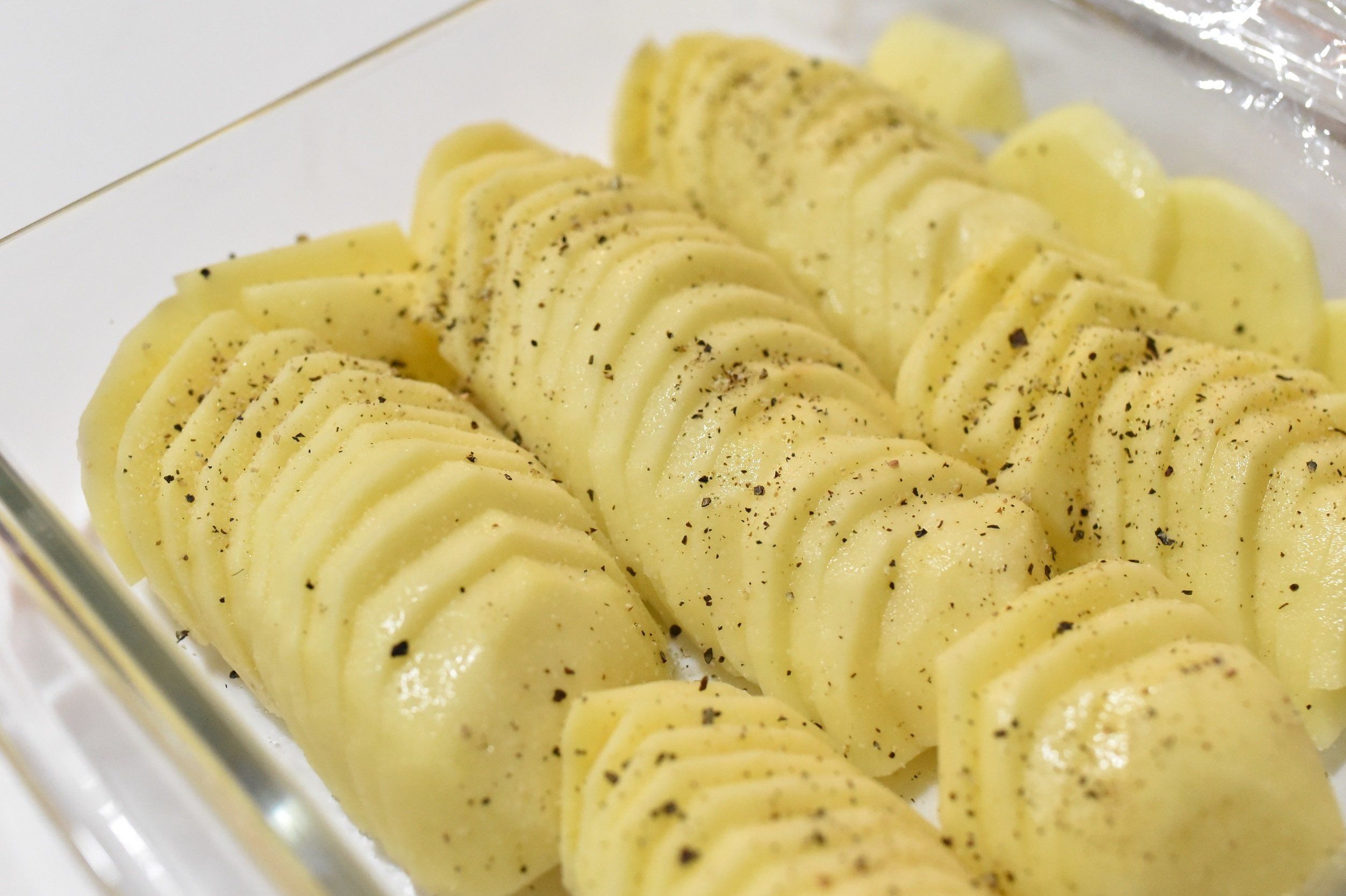皮をむいて約5mm幅にスライスしたじゃがいもを耐熱皿に並べ、ラップをしてレンジで加熱します。じゃがいもがやわらかくなったら、塩コショウをします。