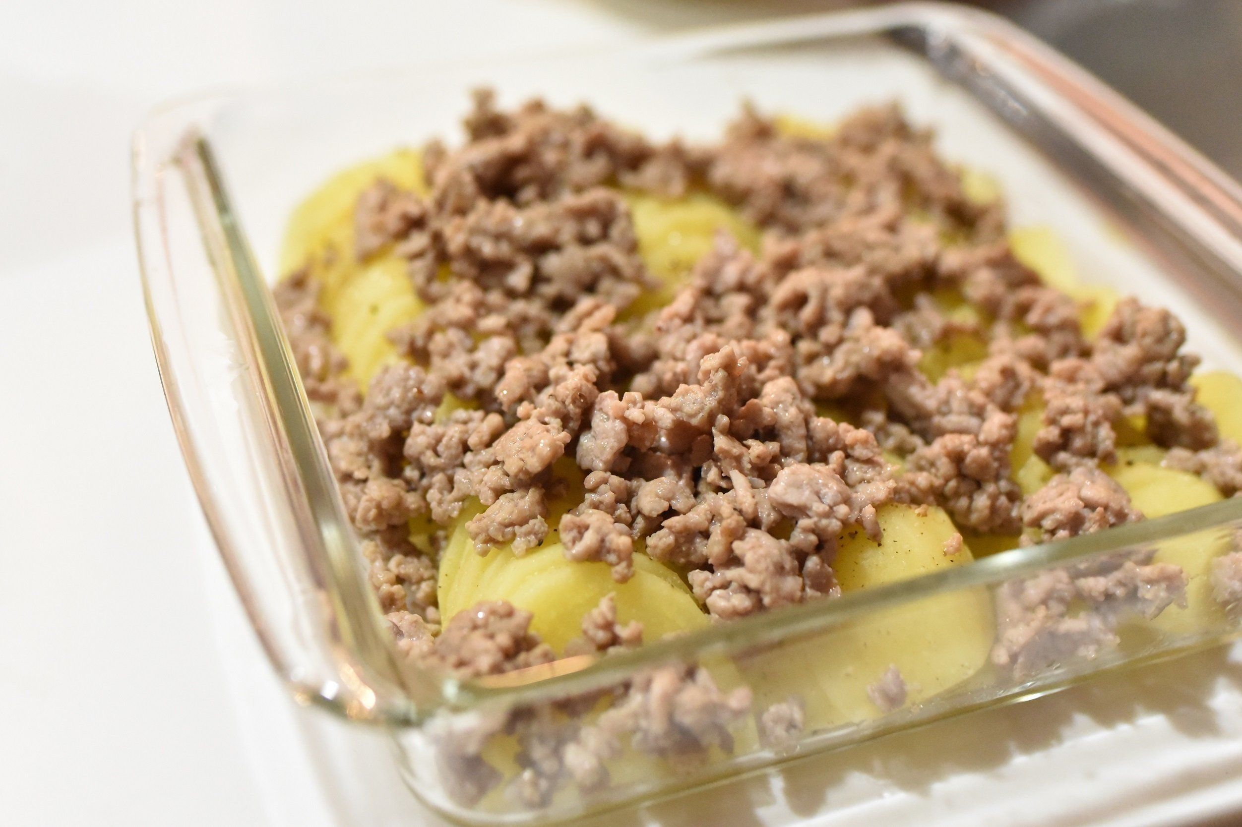 じゃがいもをレンジで加熱している間に、フライパンでひき肉を炒めておき、柔らかくなったじゃがいもの上にのせます。