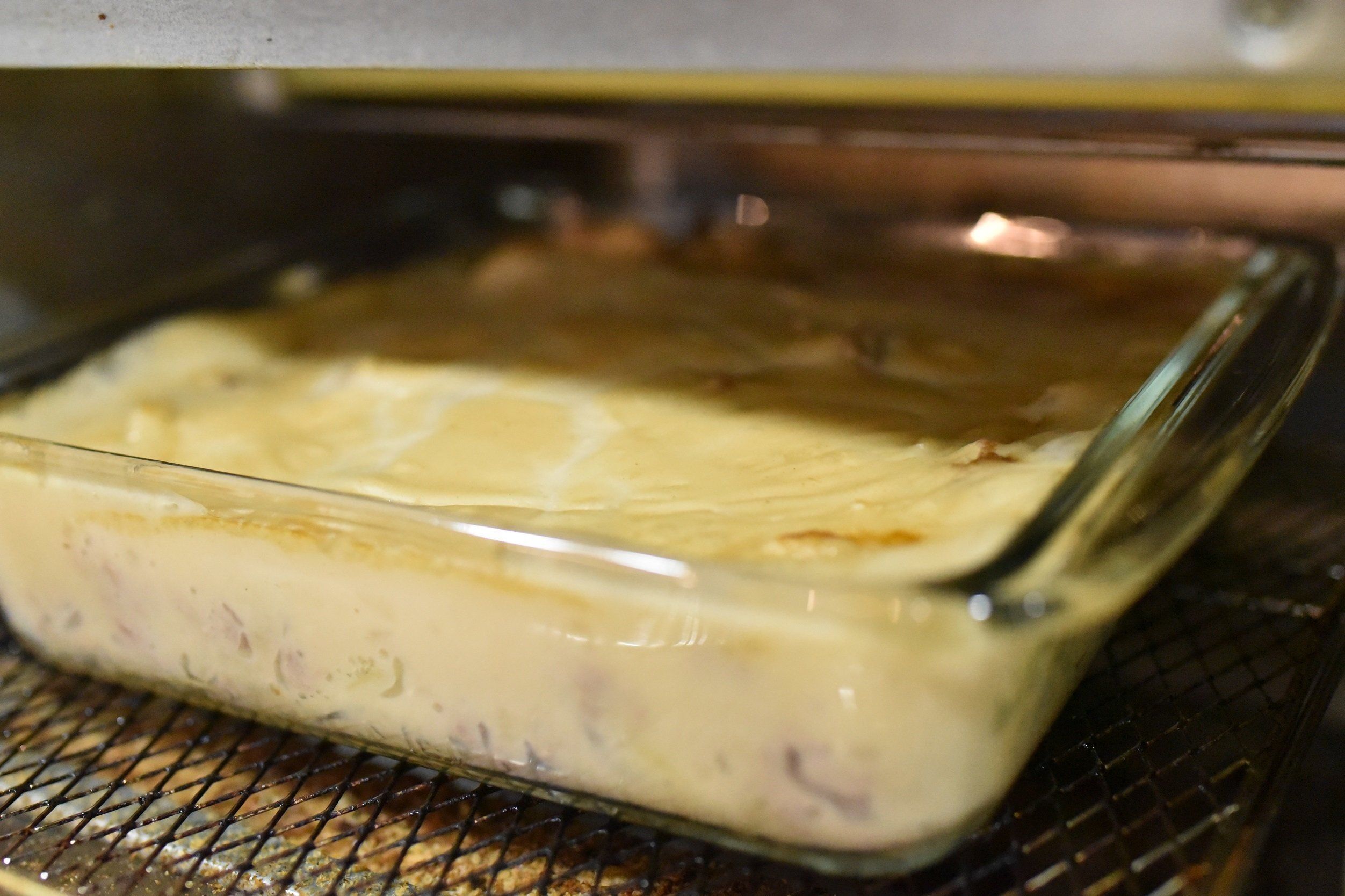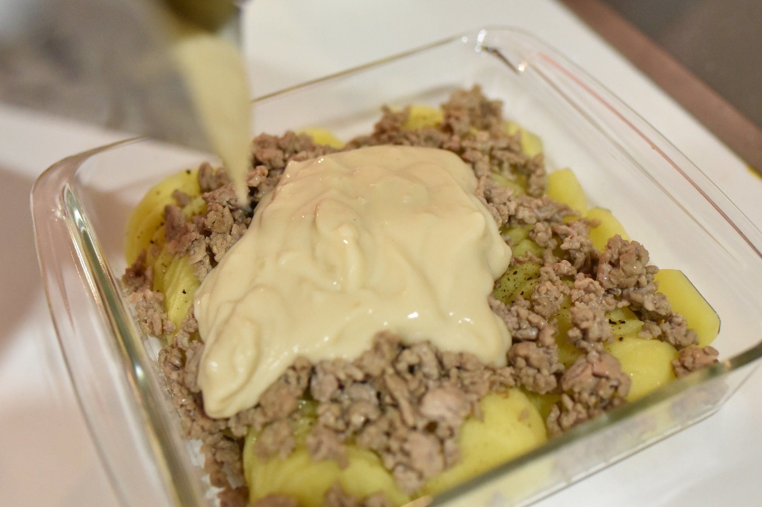 ひき肉の上にホワイトソースをたっぷりかけて、トースターで加熱します。