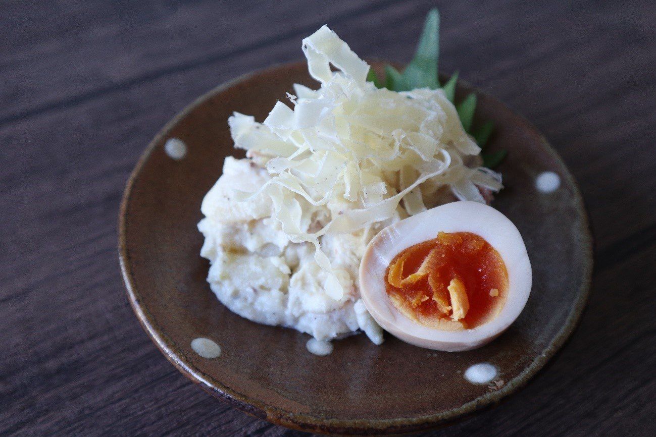 いつものポテトサラダにちょこんとのせておもてなし仕様に。見た目もちょっと変わった雰囲気で、映えます。