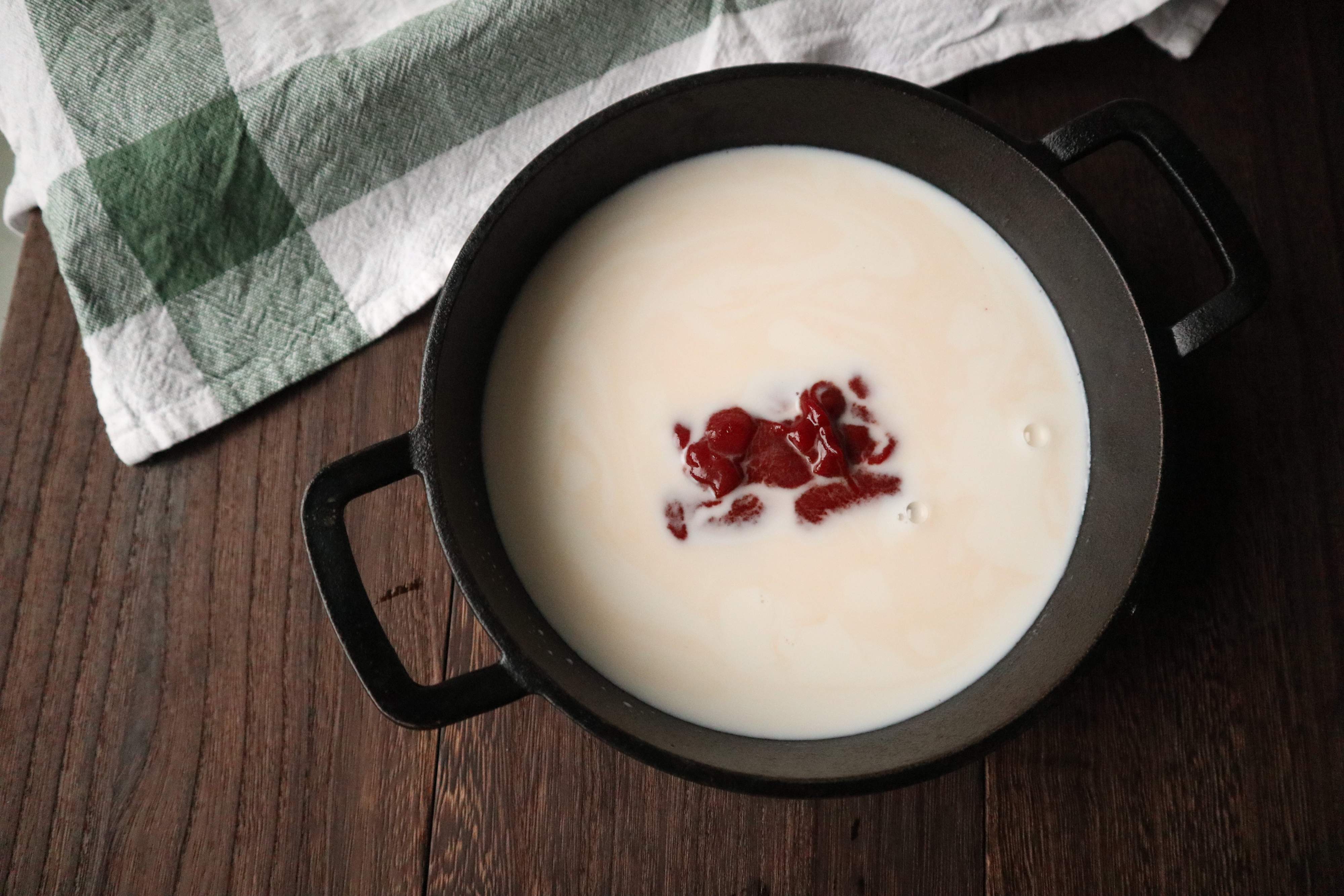 スキレット(なければフライパンでOK)に牛乳と素を1袋入れます。1袋で1~2人前つくれます。火にかけて煮立たせて、唐揚げ、パン、チーズを加えて、溶けたら完成。唐揚げは冷凍食品を使うとより手軽です。