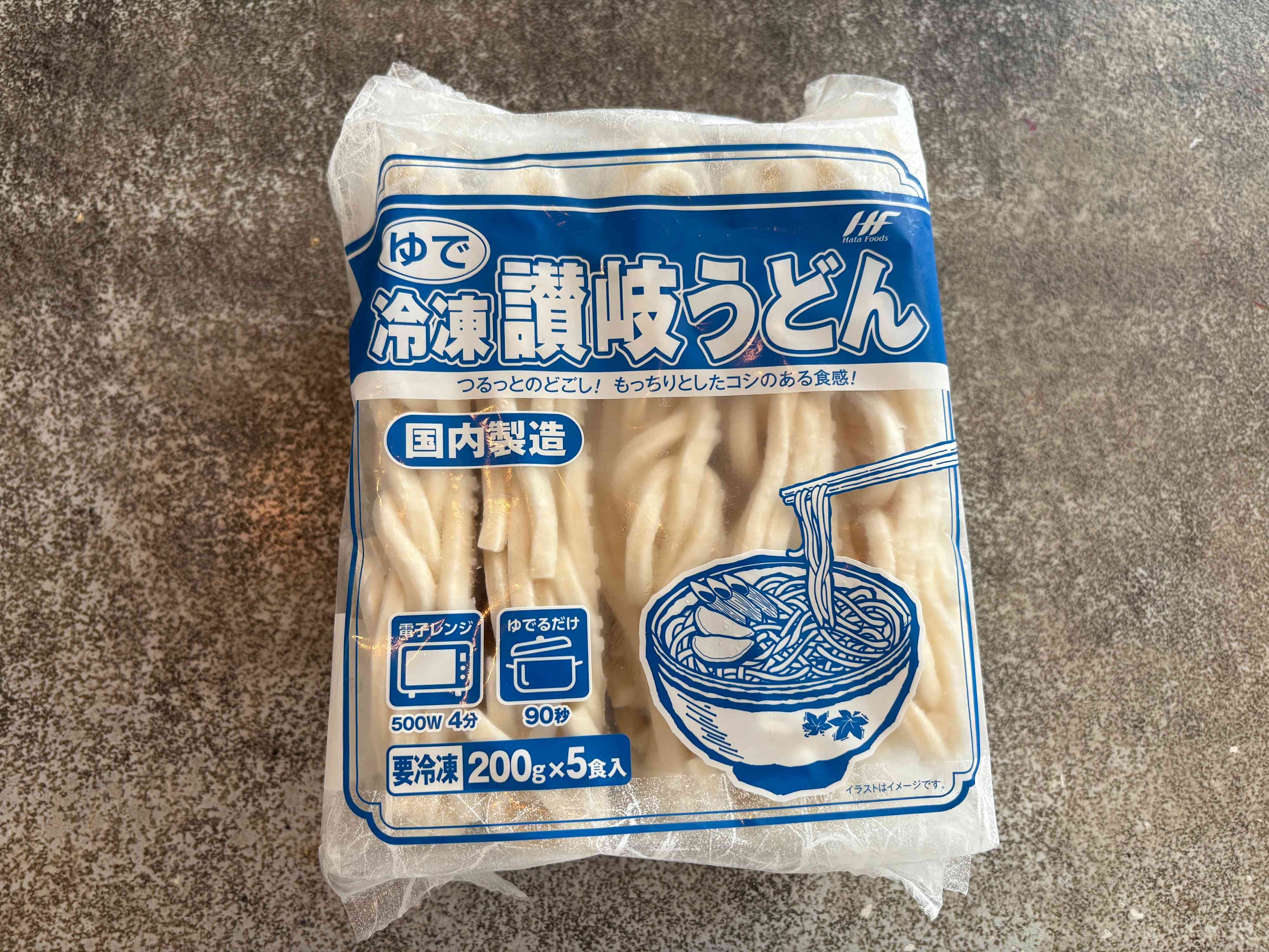 最後にご紹介するのは、業務スーパーの冷凍麺を代表する「冷凍讃岐うどん 199円」です。1袋5食入りで、1食あたりの価格は約40円です。通常の価格でも他のスーパーの冷凍うどんより断然安いのですが、セール時にはさらに安くなることもあり、先日は149円で購入することができました。
