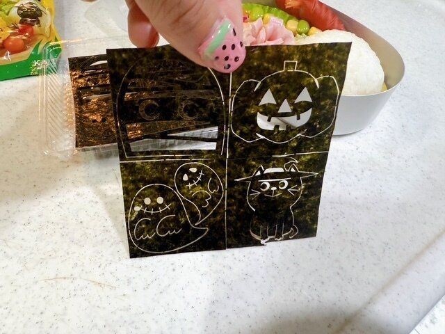 おにぎりやゆで卵など好きな食材にペタッと貼れるシート状の海苔で、しかも最初からハロウィンの型にカットされているんですよ。
