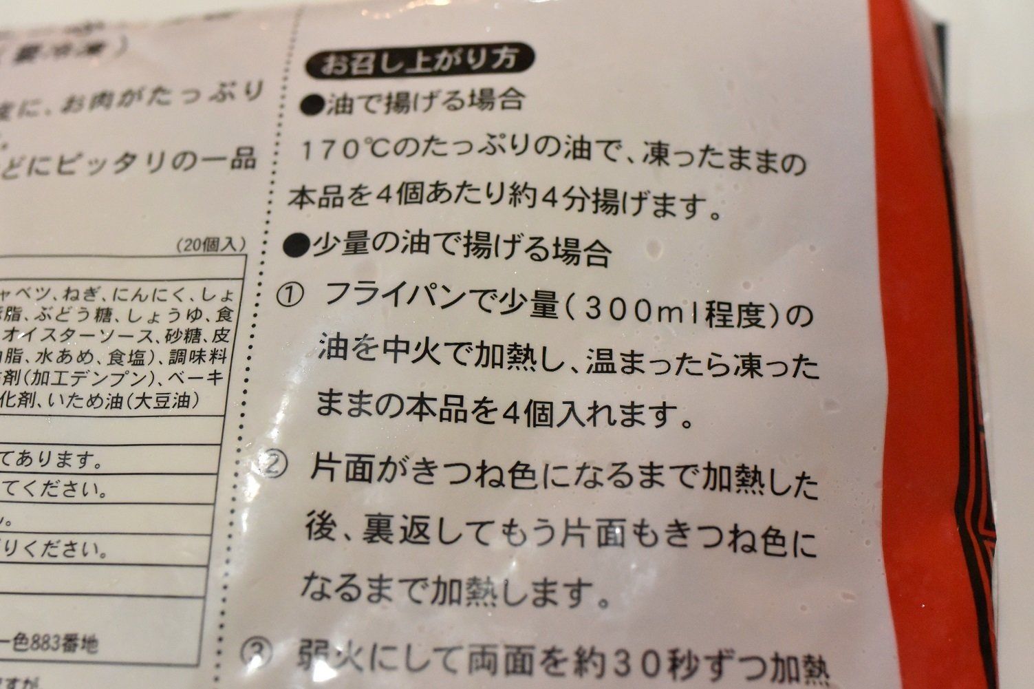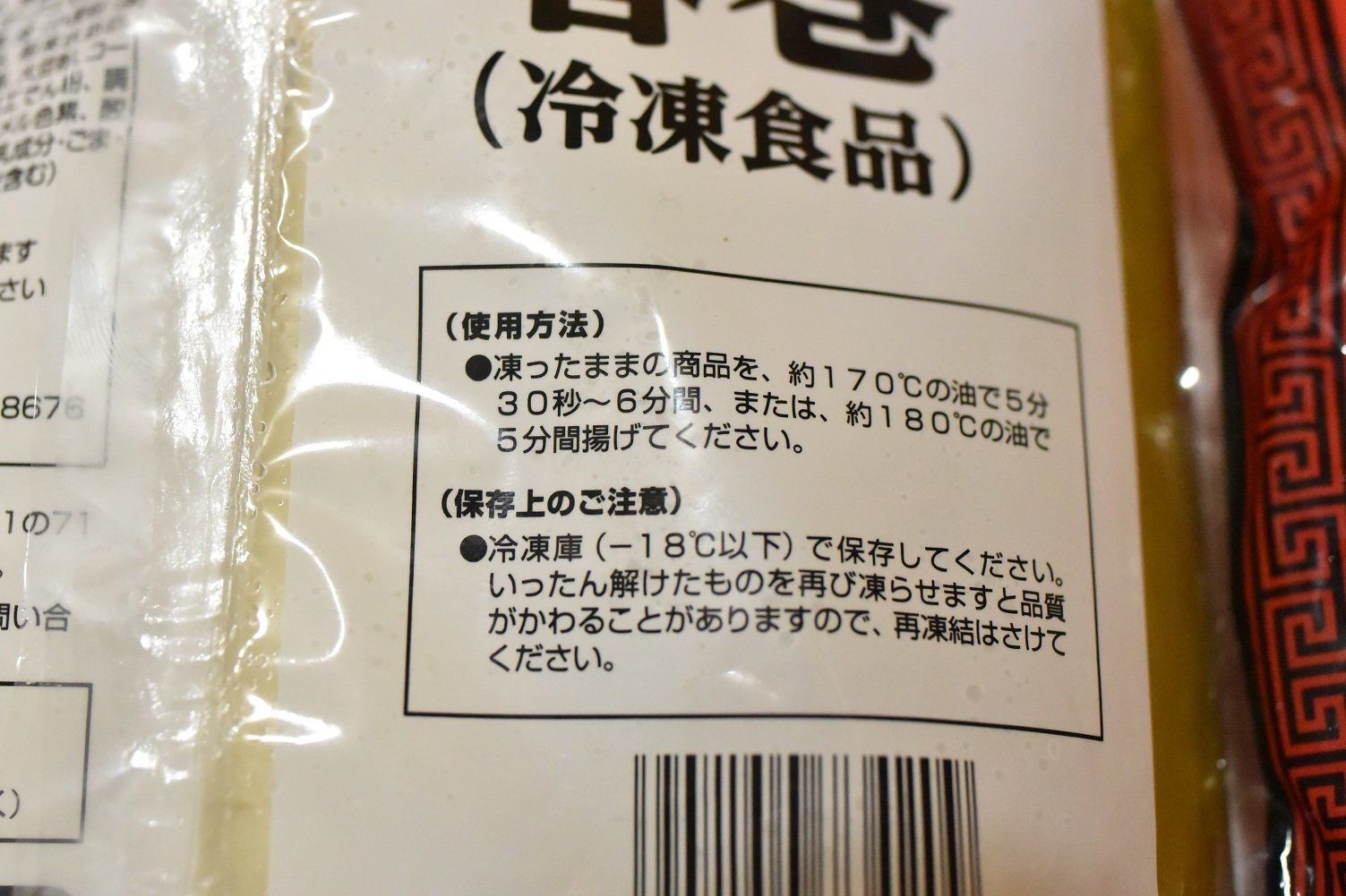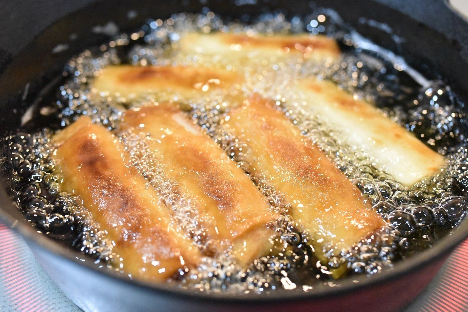 袋の裏にあるつくり方では、「170℃の油に凍ったままの春巻きを入れる」と書いてありますが、油が跳ねるのが怖い方は、油が冷たい状態から揚げ始めるのがおすすめ。調理時間が少し長くなりますが、少ない油でもカリッと揚がります。