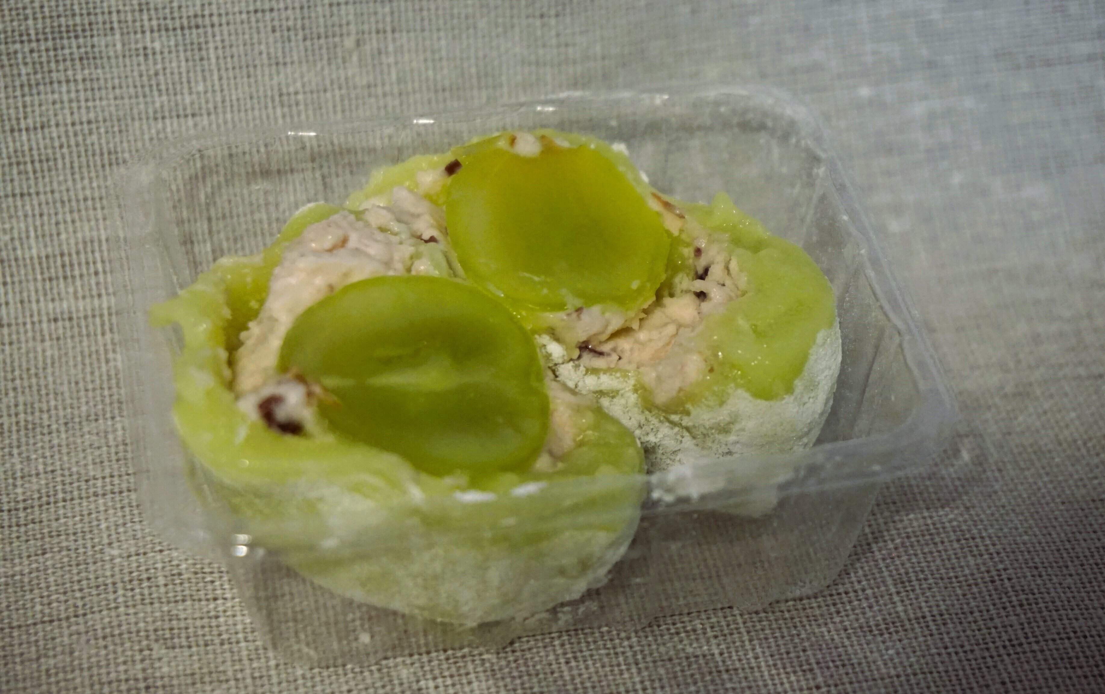 シャインマスカットが丸ごと1つ入った贅沢なこちらの商品。鮮やかなマスカット色の柔らかなお餅に、まろやかな粒あん入りホイップクリームと、ジューシーなシャインマスカットが贅沢に一粒入っています。