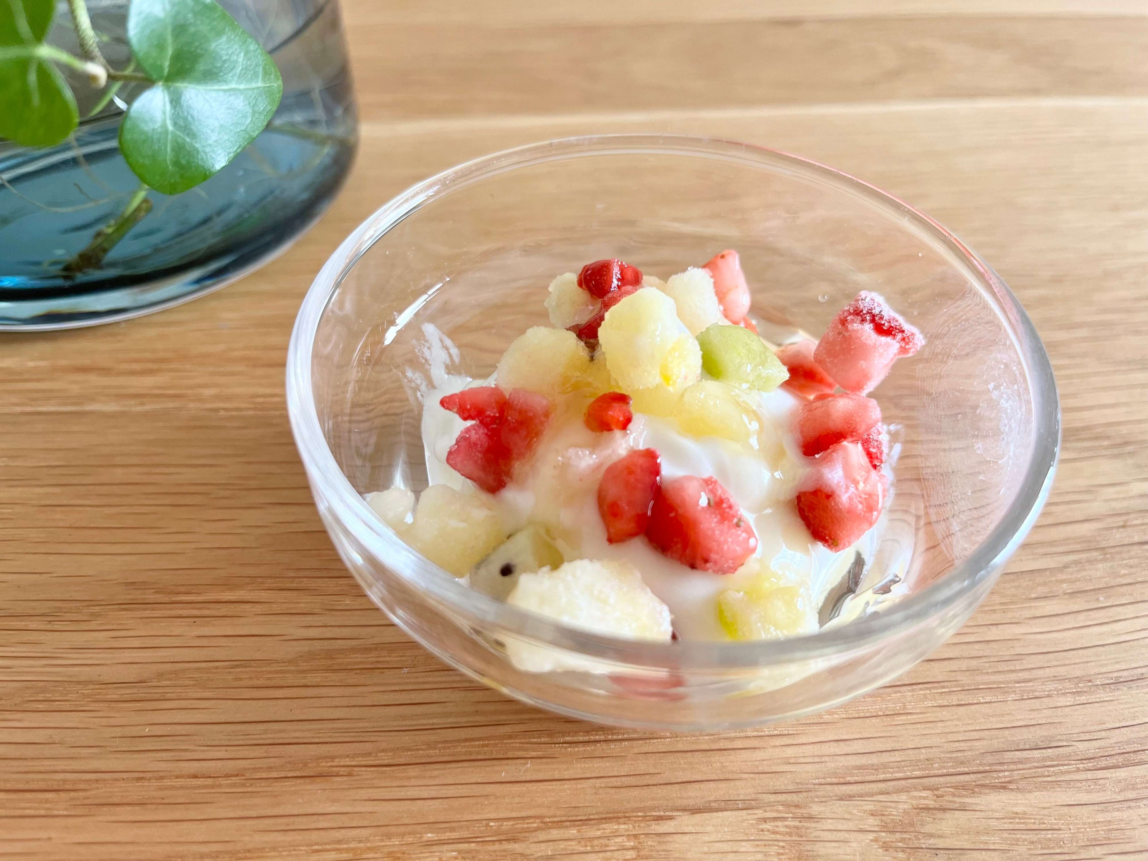 封を開けると、1cm角ぐらいにカットされた4種類のフルーツがたっぷり入っています。すでにカットされているから切る手間がいらないし、必要な分だけすぐに使えるのもうれしいポイント!