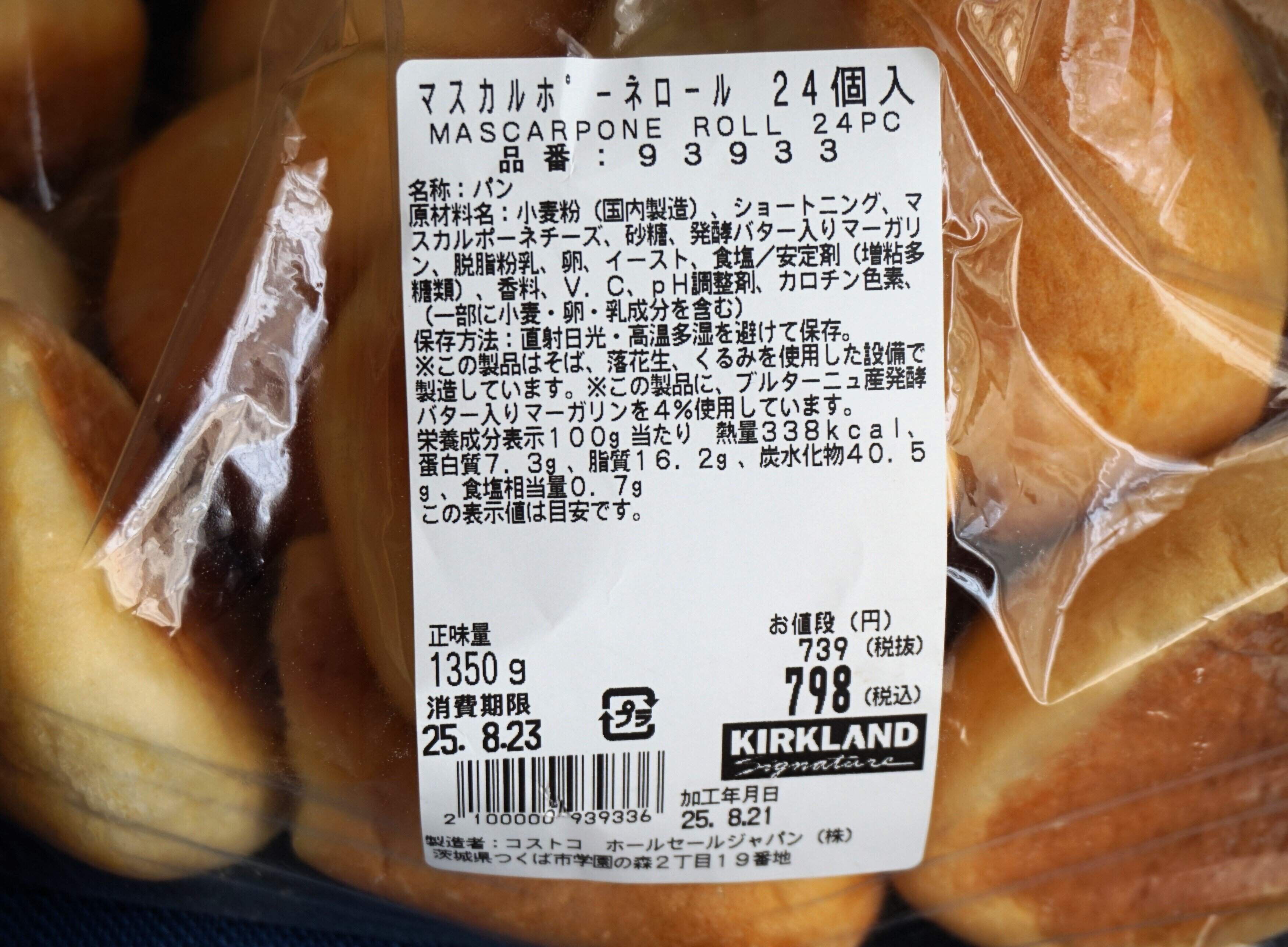 24個入り798円の大容量パン、マスカルポーネロール。1つあたり33.25円です。