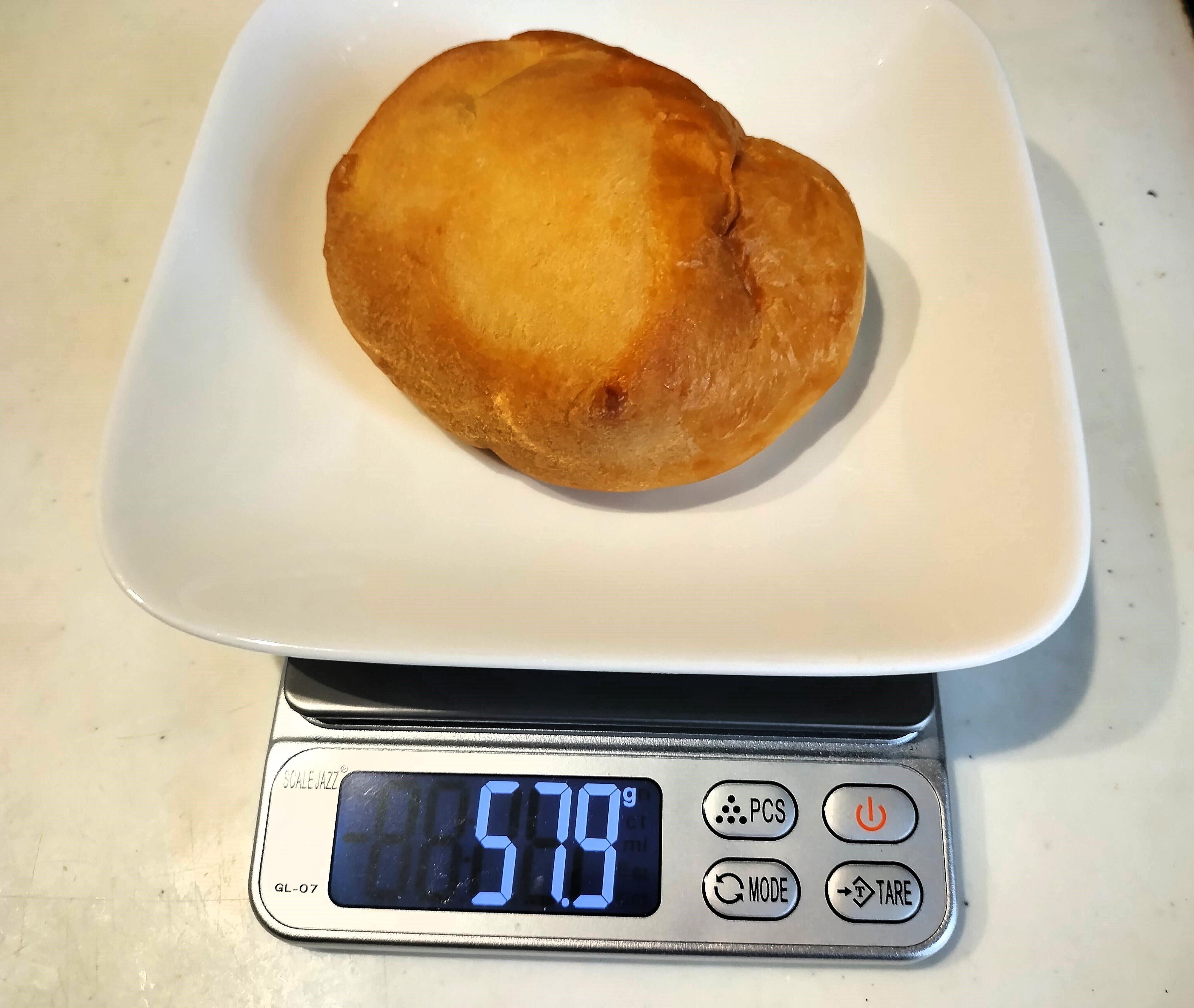 いくつか重さを測ってみたところ、筆者が購入した袋に入っていたパンは1つあたりの重さが55~63gのものが多かったです。ちなみに袋には正味量1,350gとなっています(1つあたりの平均56.25gということになりますね)。