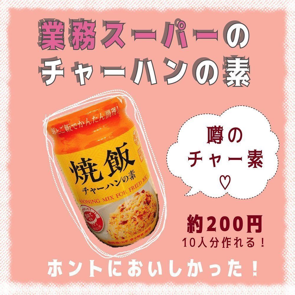 今回は業務スーパーを日頃からよく利用しているというmayu.kakei_28さんに、お買い得商品を紹介していただきます。まず最初のアイテムは、テレビでも紹介されたチャーハンの素。これ1本で簡単に基本のチャーハンが作れるのだそう。約200円という安さで10人分できるコスパの良さが魅力です。