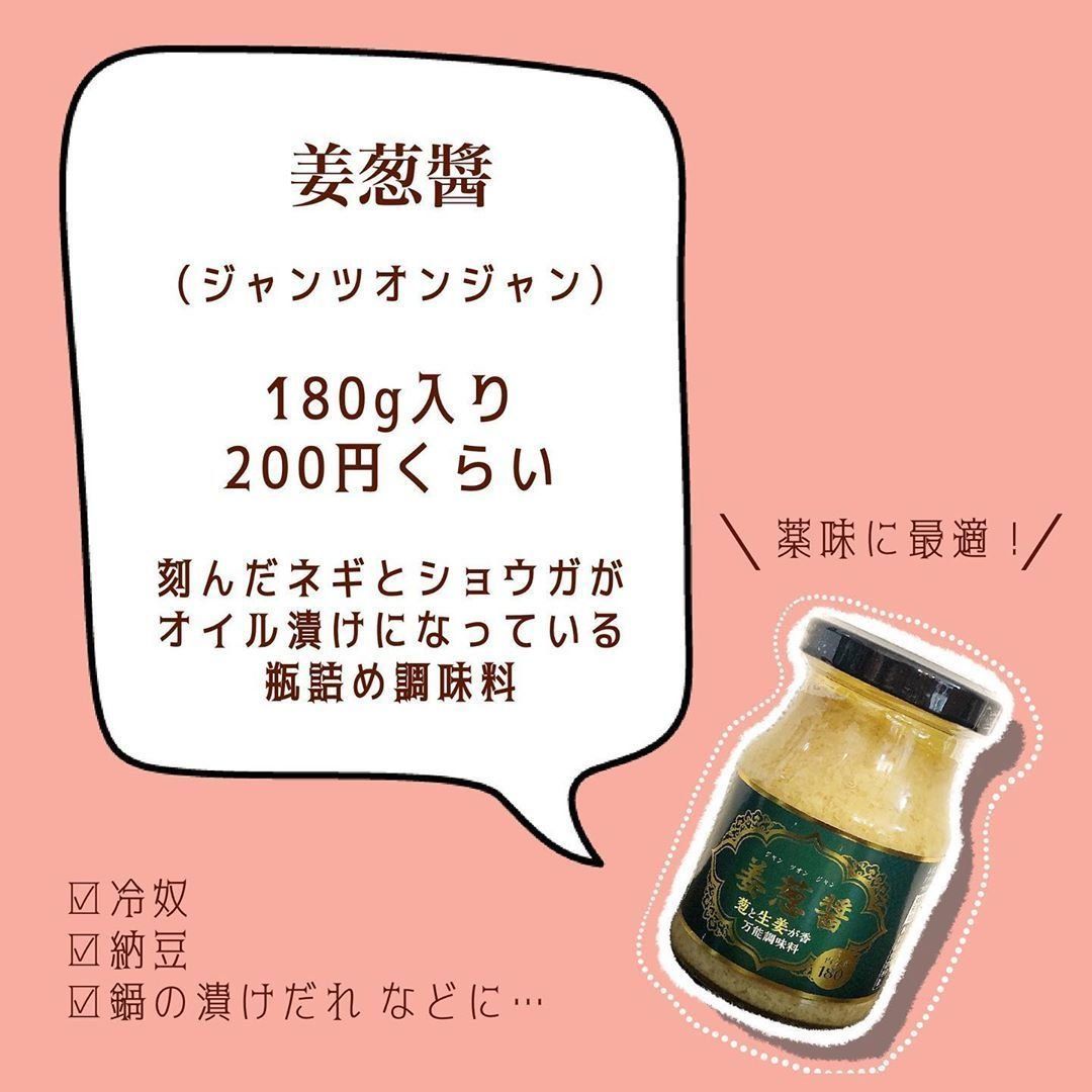 食費節約の達人mayu.kakei_28さんがオススメする万能調味料が、人気商品「姜葱醬」(ジャンツオンジャン)です。180g入りでお値段は200円ほど。刻んだ葱と生姜がオイル漬けになっている薬味に最適な調味料です。鍋物や汁物へのチョイ足しがオススメだそうですよ!