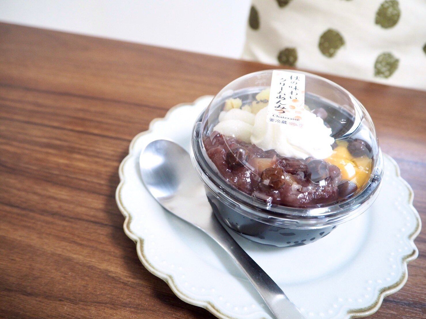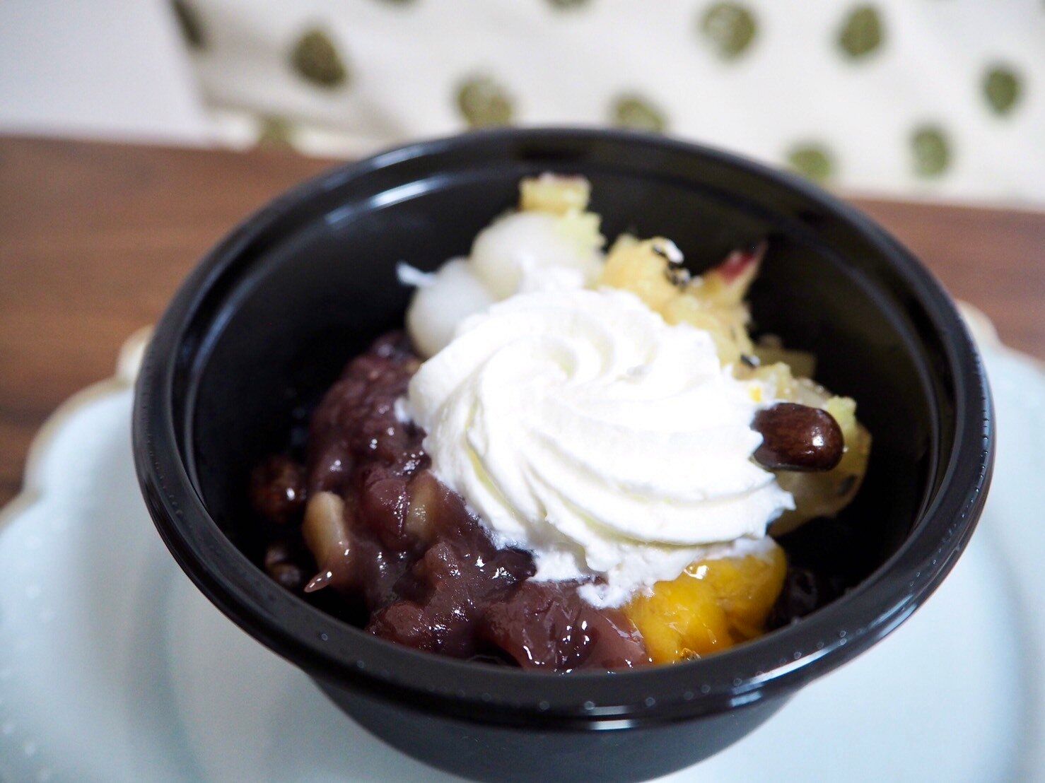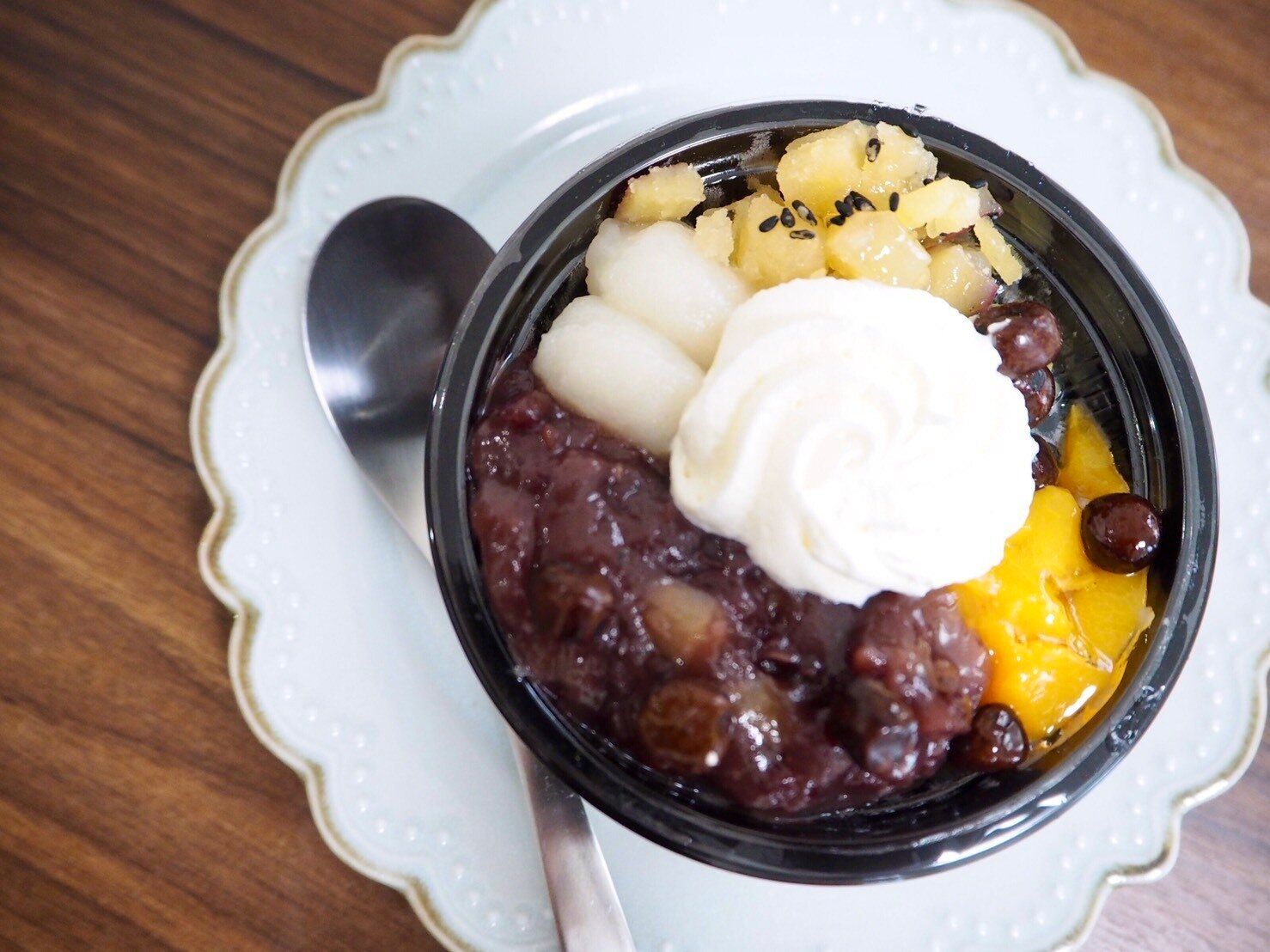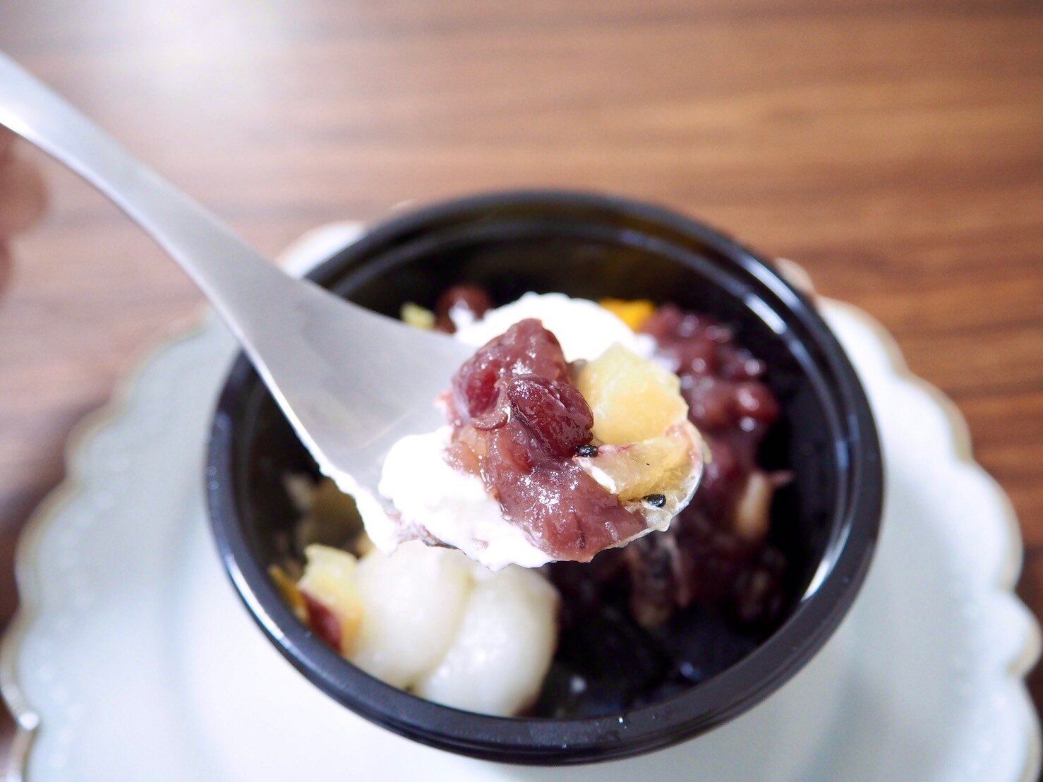蓋を取って上から覗いてみると、さつまいも甘露煮、自家製白玉、自家炊き栗入り粒餡、黄桃シロップ漬け、塩豆(赤えんどう豆)、その上にホイップクリームがのっていてカラフルではないのに華やかです。