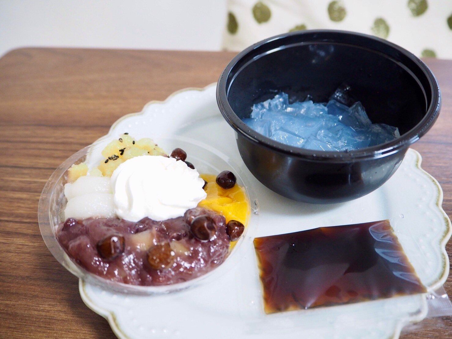 そのまま食べられそうな見た目ですが、じつはカップが二層になっているんです。あんみつに黒蜜をかけ、さらに上から具材をのせる方式です。