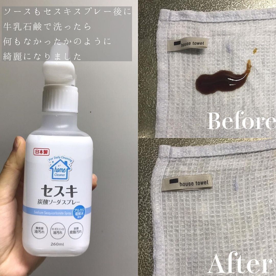 キッチンの油汚れに効果を発揮してくれるのがセスキ炭酸ソーダスプレー。ギトギトに汚れたガスコンロのまわりもきれいにしてくれます。布についた油汚れにも効果があるので、洗濯前に軽くスプレーしておくときれいに汚れが落ちます。