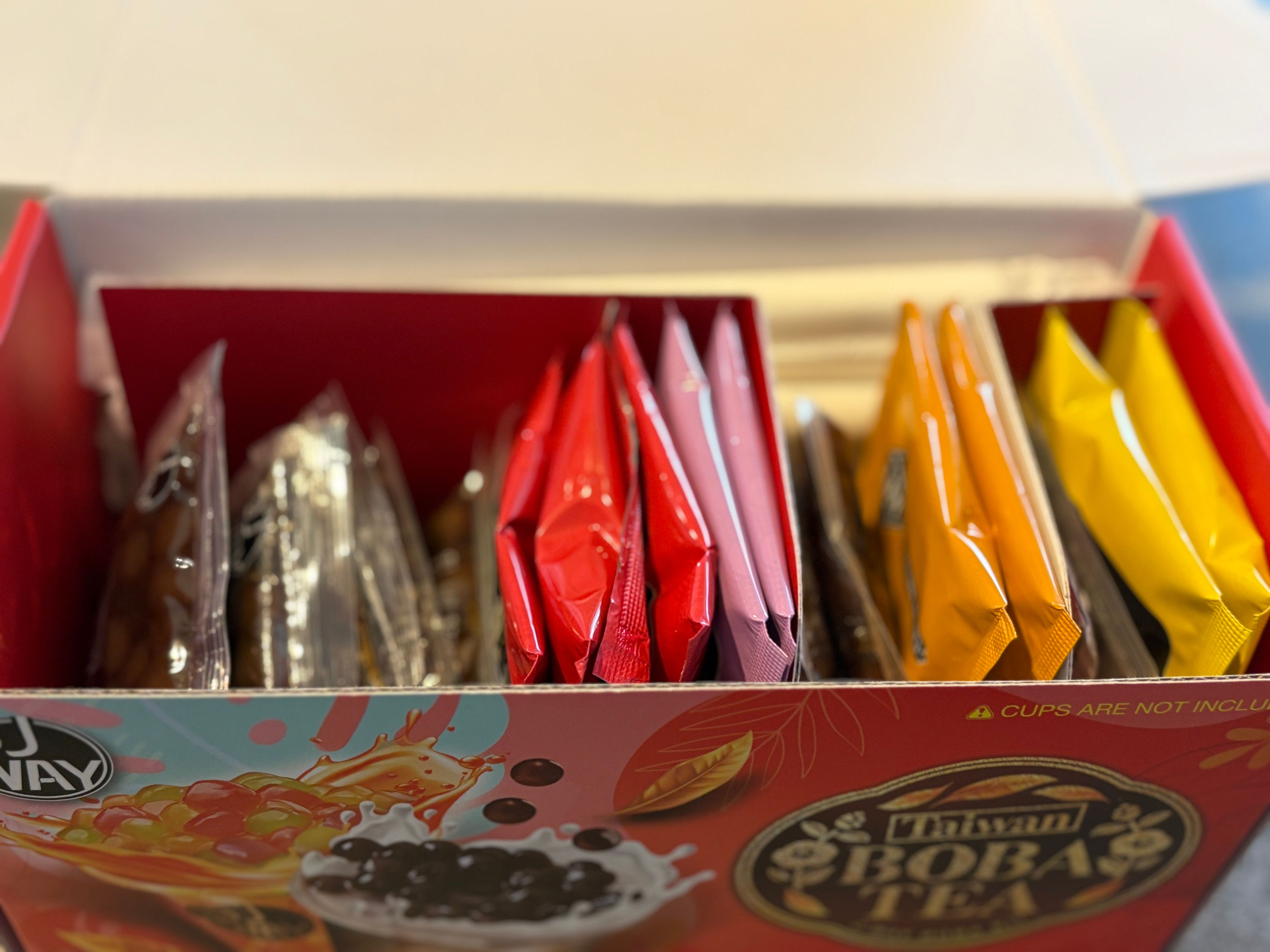 箱の中には、ドリンクの粉末とタピオカ、ストローがセットになっています。味はクラシックミルクティー・タロイモミルクティー・クレームブリュレミルクティー・パッションフルーツティーの4種類。クラシックミルクティーは4杯分、そのほかの味はそれぞれ2杯分ずつ入っていました。