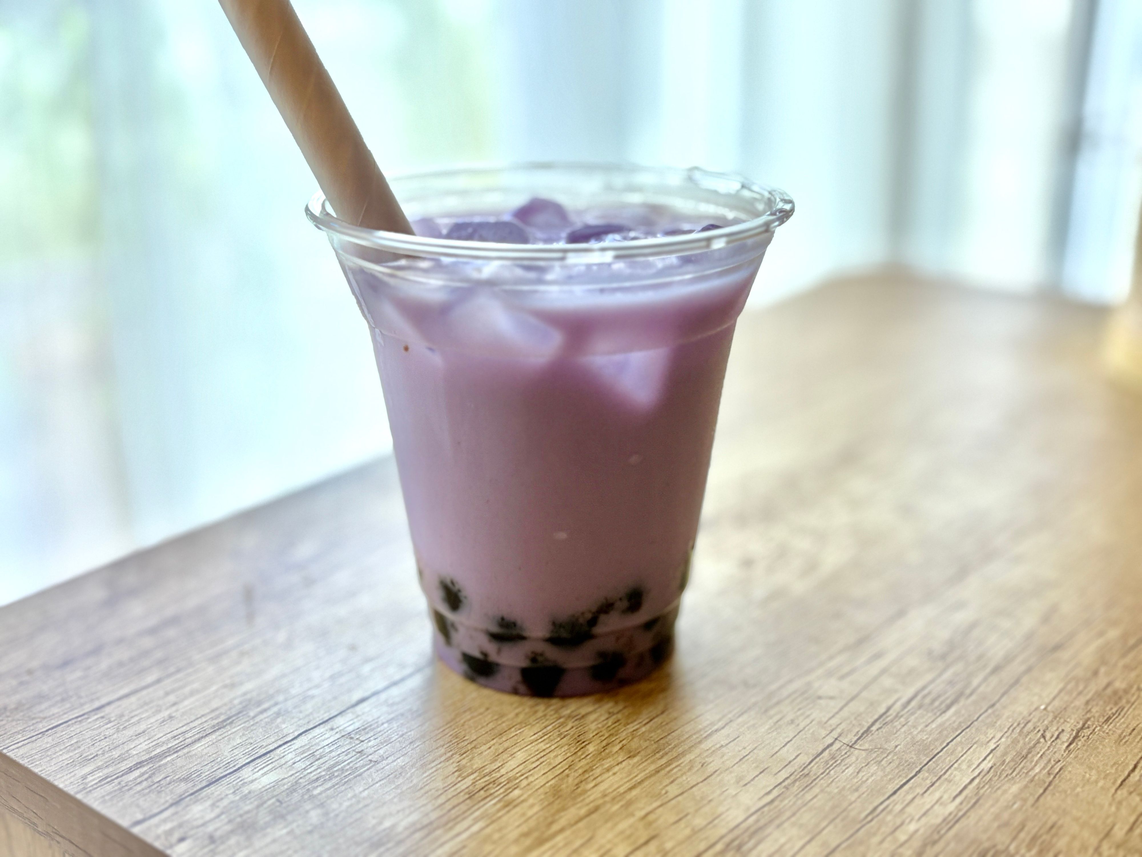 きれいな紫色が目を引く「タロイモミルクティー」。タロイモは里芋の仲間の植物で、さつまいもや紅芋にも近いやさしい甘みとコクがあります。