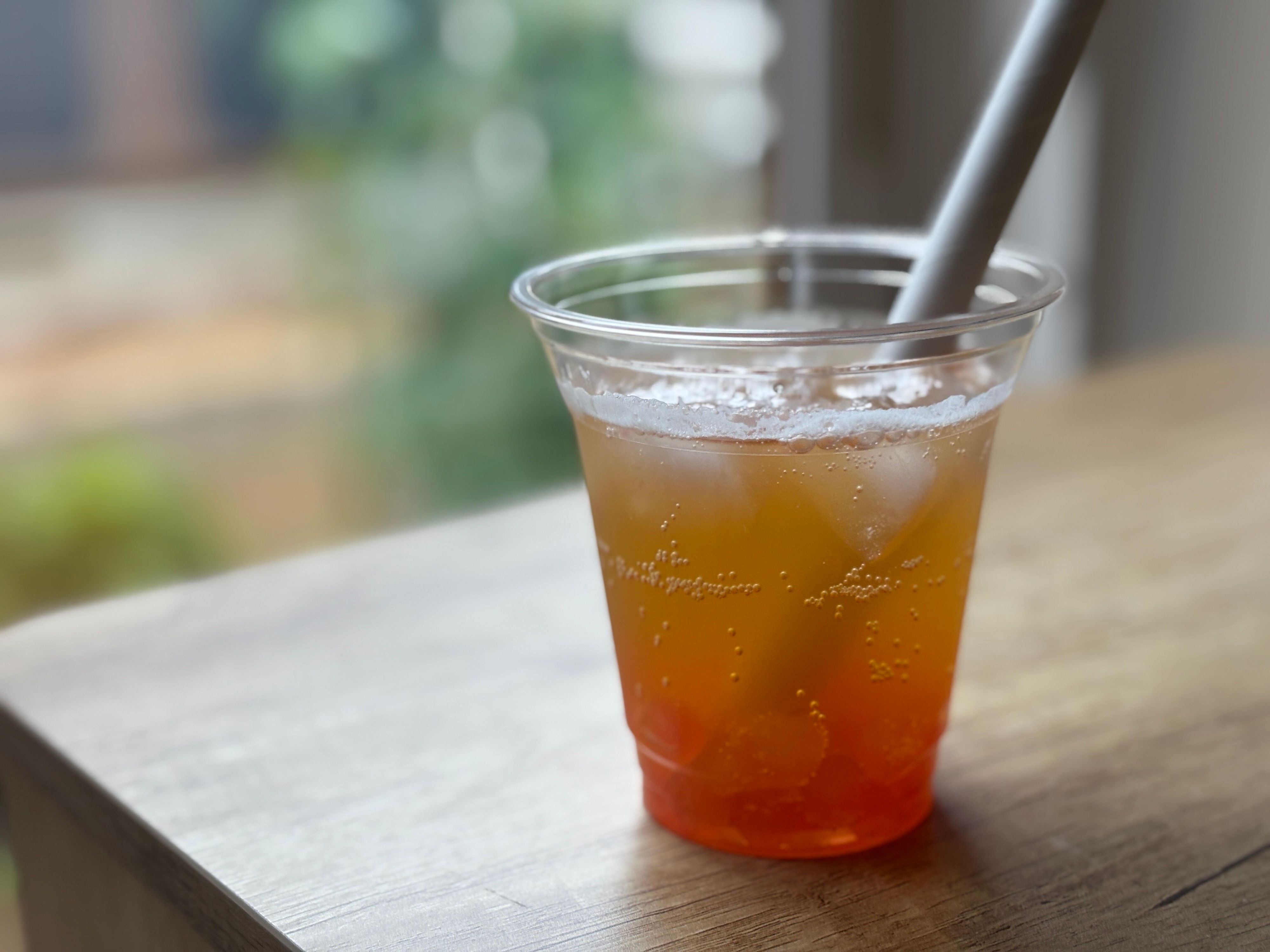 粉末をお湯で溶かした後、水のかわりに炭酸水を注いでパッションフルーツティーソーダにするのもおすすめです。