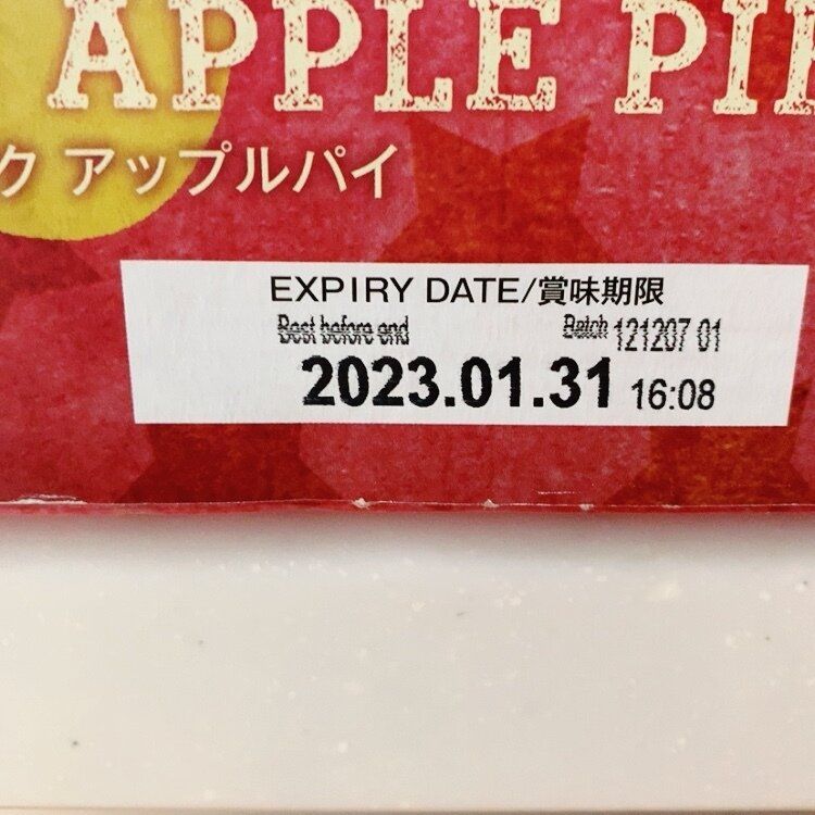 原材料名:りんご、小麦粉、砂糖、植物油脂、レーズン、卵、コーンスターチ、乳糖、アプリコットピューレ、食塩、シナモン、卵粉末、グルコースシロップ、小麦でん粉、ぶどう糖/糊料(加工デンプン、CMC、グァーガム、ペクチン)、膨張剤、、乳化剤、香料、pH調整剤、着色料(カロチン)、酸味料、(一部に卵・乳成分・小麦・りんごを含む)