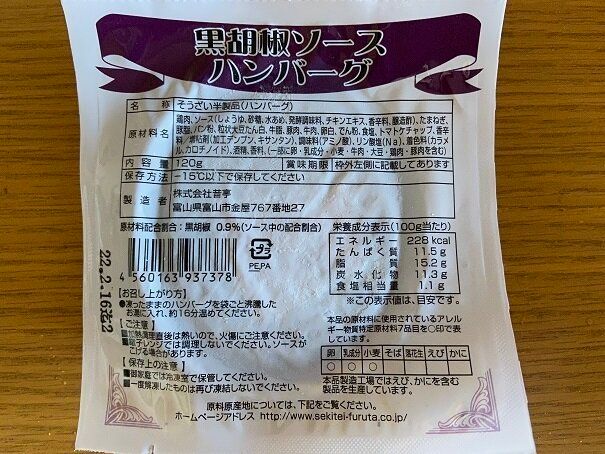 冷凍のお肉コーナーに販売されている1個売りの「黒胡椒ソースハンバーグ」(購入時:95円)です。冷凍ハンバーグはいろいろな種類が並んでいますが、1人前1個入り、というのが使いやすくていいですね。