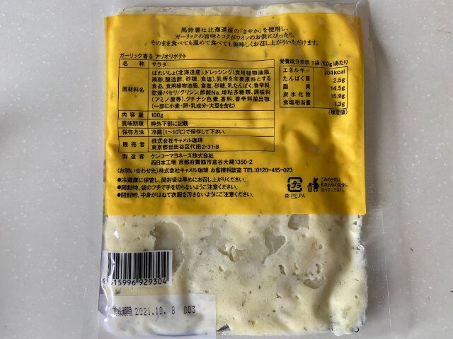 北海道産のばれいしょを使った、「ガーリック香る アリオリポテト」(購入時:199円税込)はチーズや乳製品が並ぶ冷蔵コーナーで販売されていました。