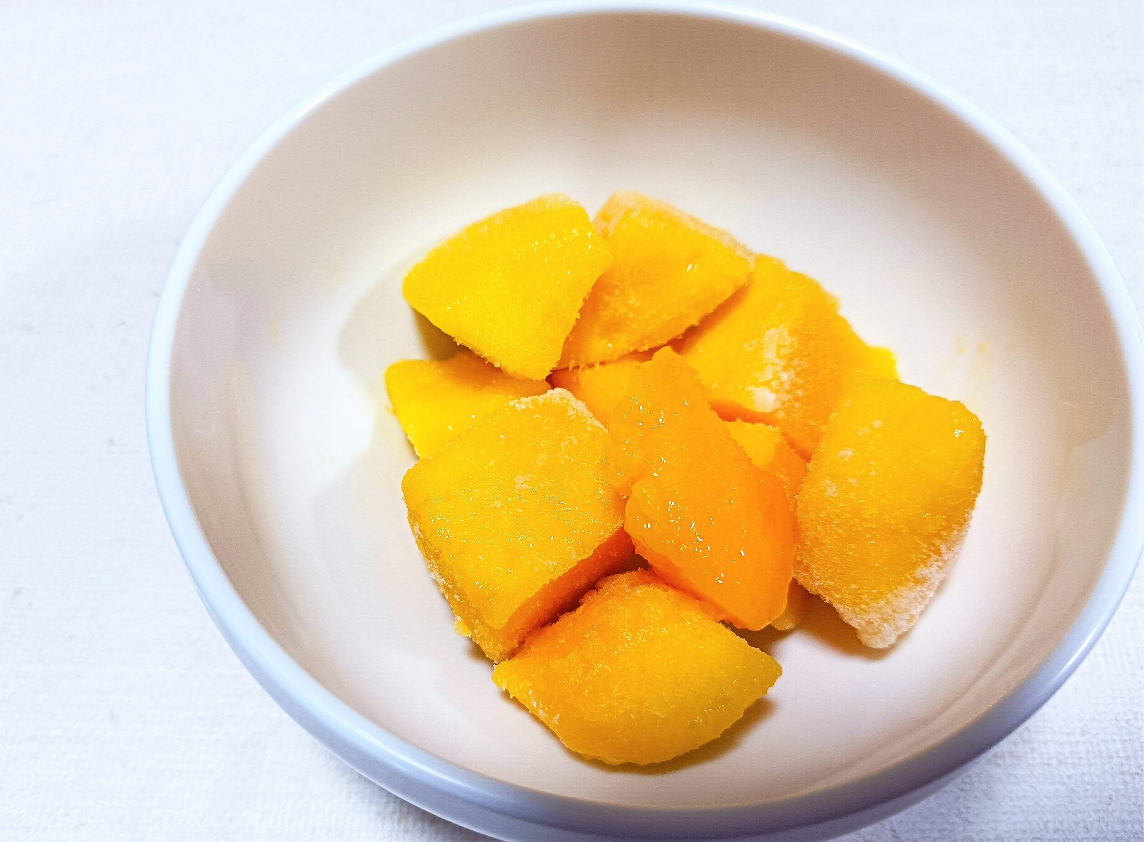 出した直後はカチカチに凍った状態です。マンゴーのねっとり感を楽しみたい場合は、少しおいておいて溶けてから楽しむとよいかと思います。