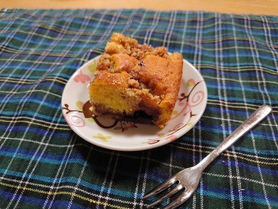 パウンドケーキの生地の上にブルーベリージャムを塗り、その上にクランブルをのせて焼きました。