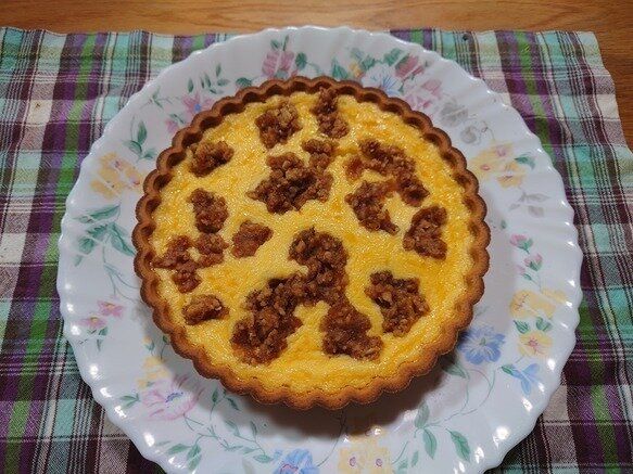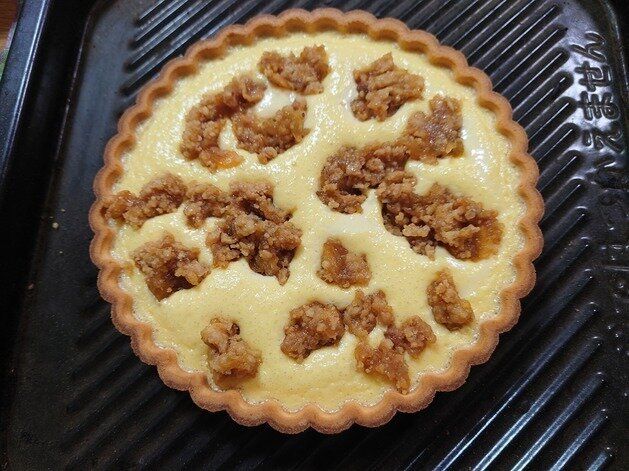 私は市販のタルト生地を使いました。焦げそうなときは、途中でアルミホイルを全体にかぶせると焦げることを防げます。