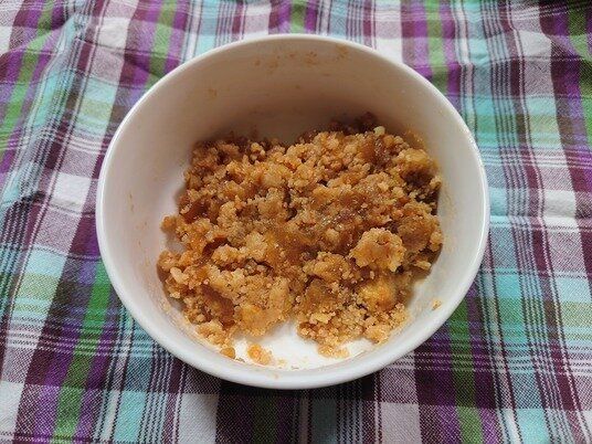 分かりにくいですが、スプーンですくうと写真のとおり二層になっています。下がアップルシナモン、上がそぼろ状の生地です。