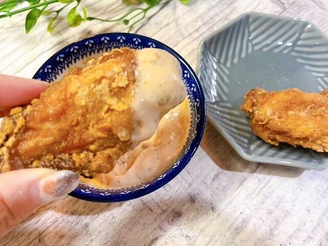 そして、唐揚げにもつけて食べてみました!唐揚げにマヨネーズつけたらすごくこってりしすぎるかなと思ったのですが食べてみるとさっぱり!梅の酸味が唐揚げをさっぱりさせてくれるので揚げ物にも合います。