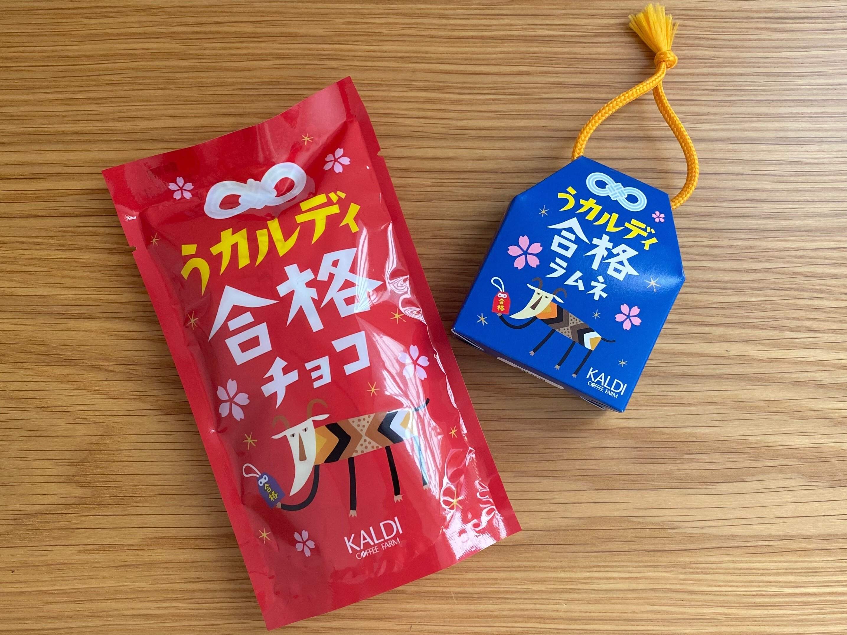 カルディのオリジナルキャラクター「やぎべぇ」と「モモめえ」とともに、受験生を応援する言葉がプリントされています。