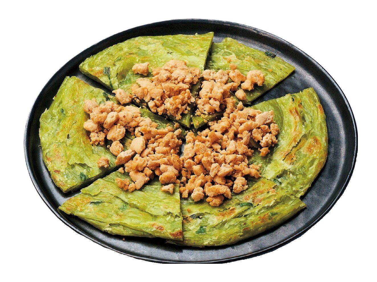 外はサクッ中はモチッの食感がたまらない台湾フード。ほうれん草入りで、おかずとしても優秀!甘辛く炒めたひき肉をのせると絶品。