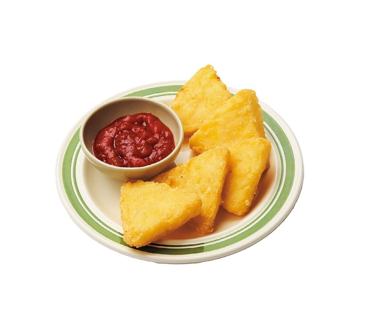 ハッシュポテトにチーズが練り込まれていて、カリッホクッ感と濃厚な味わいに感動!ピリ辛サルサをディップすると、止まらないおいしさ。