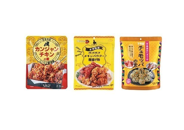 (左から)「オリジナル 韓国カンジャンチキンの素」(70g)¥237、「モッバン 本場韓国ザクザクチキンパウダー」(170g)¥213、「オリジナル チュモッパの素」(1.5合分)¥518