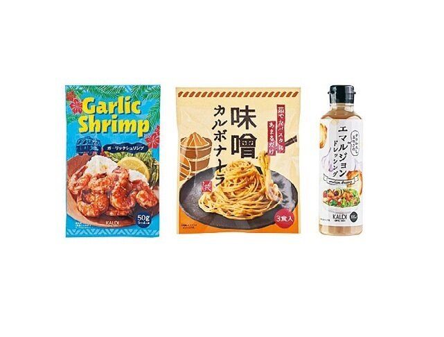 (左から)「オリジナル ガーリックシュリンプ」(50g)¥189、「もへじ 味噌カルボナーラ」(1人分×3袋)¥298、「オリジナル エマルジョンドレッシング」(300ml)¥448