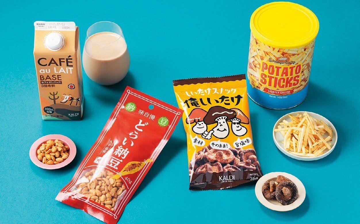 (左から)「オリジナル カフェオレベース」(500ml)¥429、「もへじ どらい納豆うす塩味」(40g)¥313、「オリジナル しいたけスナック 俺しいたけ」(36g)¥250、「サラトガスプリング ポテトスティック ライトソルト」(142g)¥537