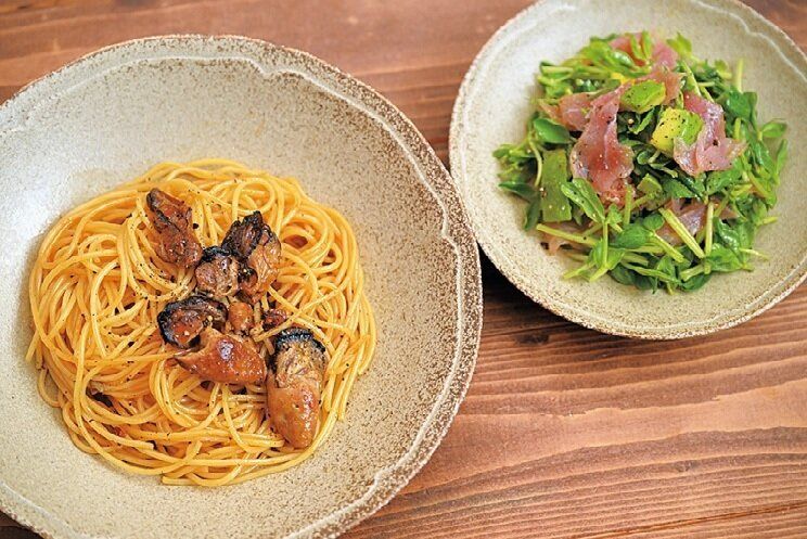 香ばしくて柔らかいスモーク牡蠣をぜいたくに使用したパスタ。牡蠣の旨みたっぷりなので、味付けはしょうゆのみでシンプルに。サラダには肉厚で香り豊かな生ハムをたっぷり使用!