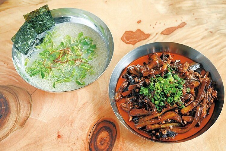 豆鼓(トウチ) や甜面醤(テンメンジャン)、麻辣醤(マーラージャン)の旨みとコクが本格的な黒麻婆豆腐の素でなすとひき肉を炒めれば、中華屋さんの味に。コク深い牛テールのコムタンスープ(豆苗と春雨入り)を添えて。