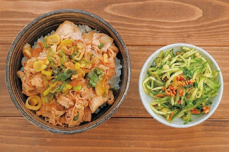 豚バラ肉とたっぷり長ねぎを炒めて、にんにくしょうゆが香ばしいスタミナ丼のたれであえれば超速でどんぶりが完成!きゅうりはざくざくだれ+めんつゆであえて、さっぱり副菜に。
