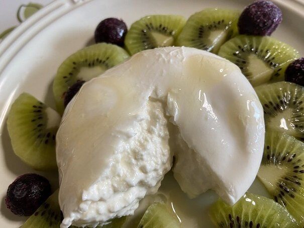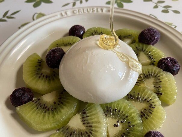 お好みのフルーツをお皿に盛りつけブラータをのせます。その上から蜂蜜をかけて…