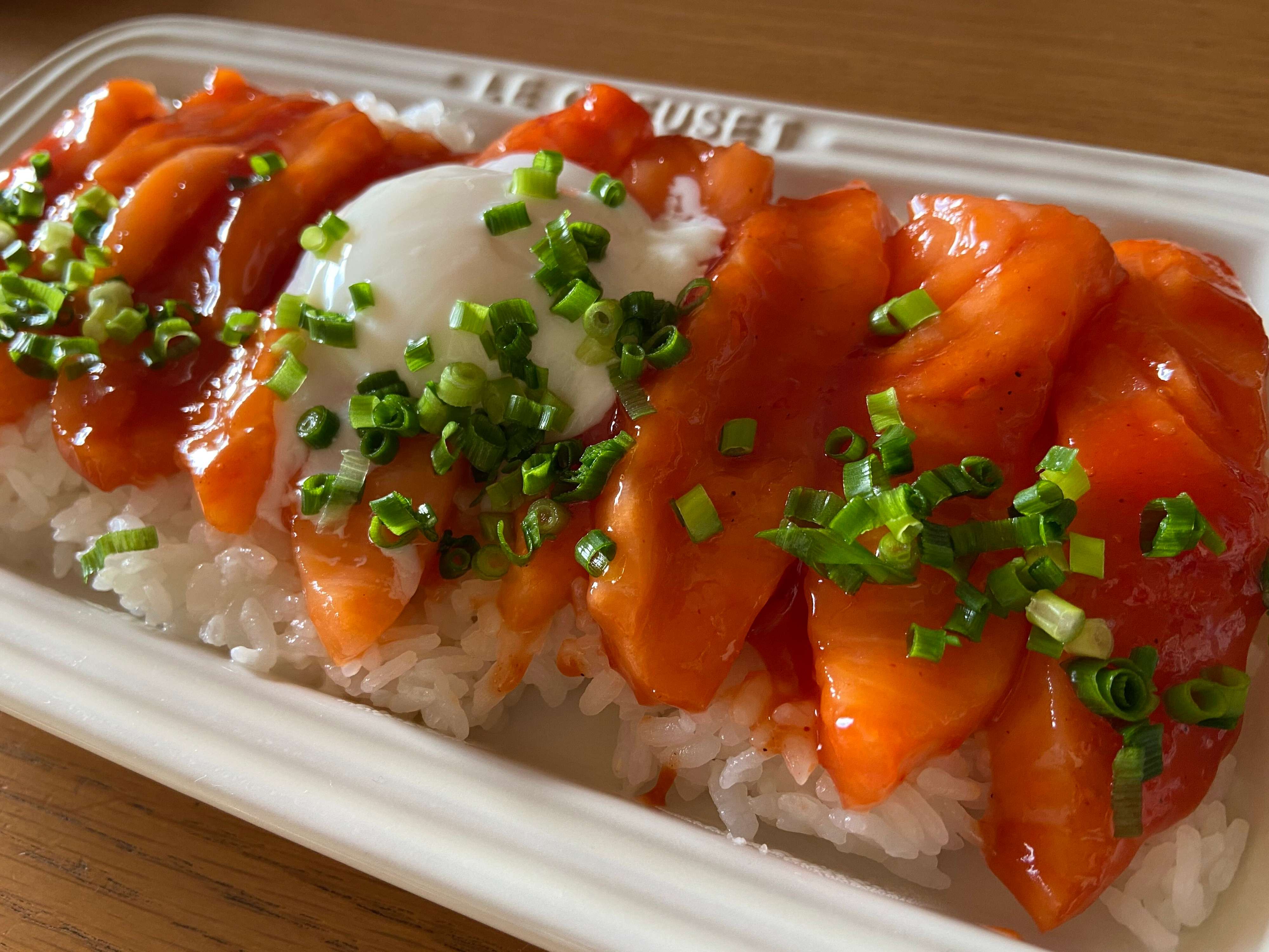 おすすめのアレンジはサーモンのお刺身に和えたヤンニョムサーモン。たっぷりソースをからめたサーモンをご飯の上にのせて温泉玉子をトッピング。これが家族からも大好評のおいしすぎる一品!