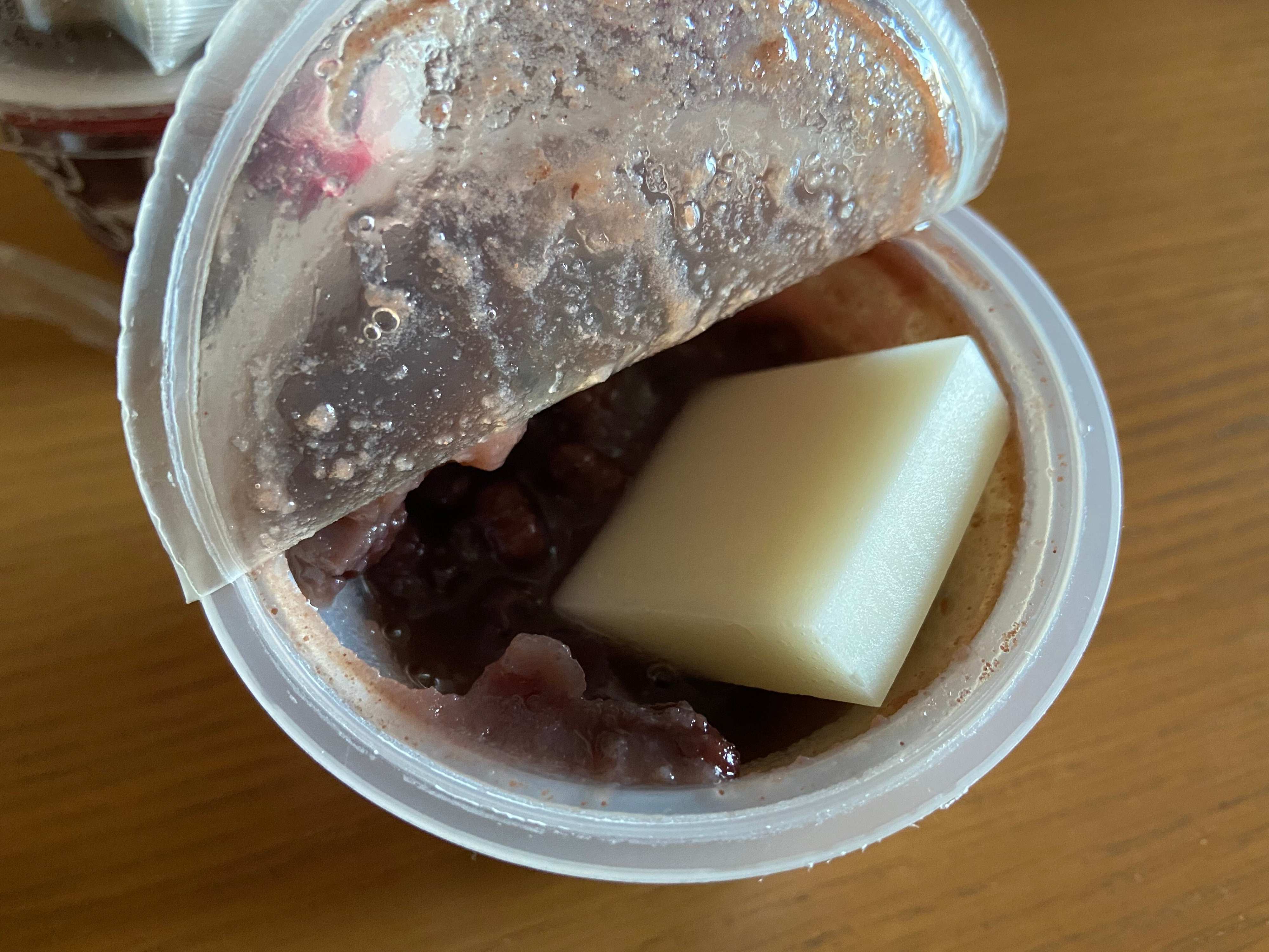 まずカップの内フタを半分ほど開けて、お餅をぜんざいの中に沈めます。内フタを閉じて電子レンジ500W1分40秒ほど加熱。お餅がまだ固い場合は10秒ずつ追加で加熱します。