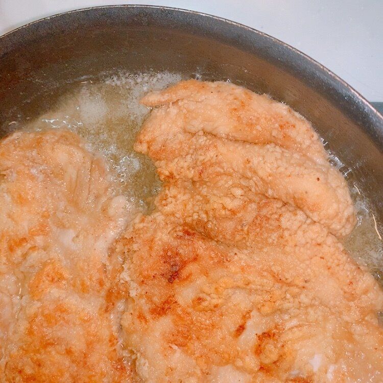 大き目なフライパンに、鶏肉を入れて揚げています。