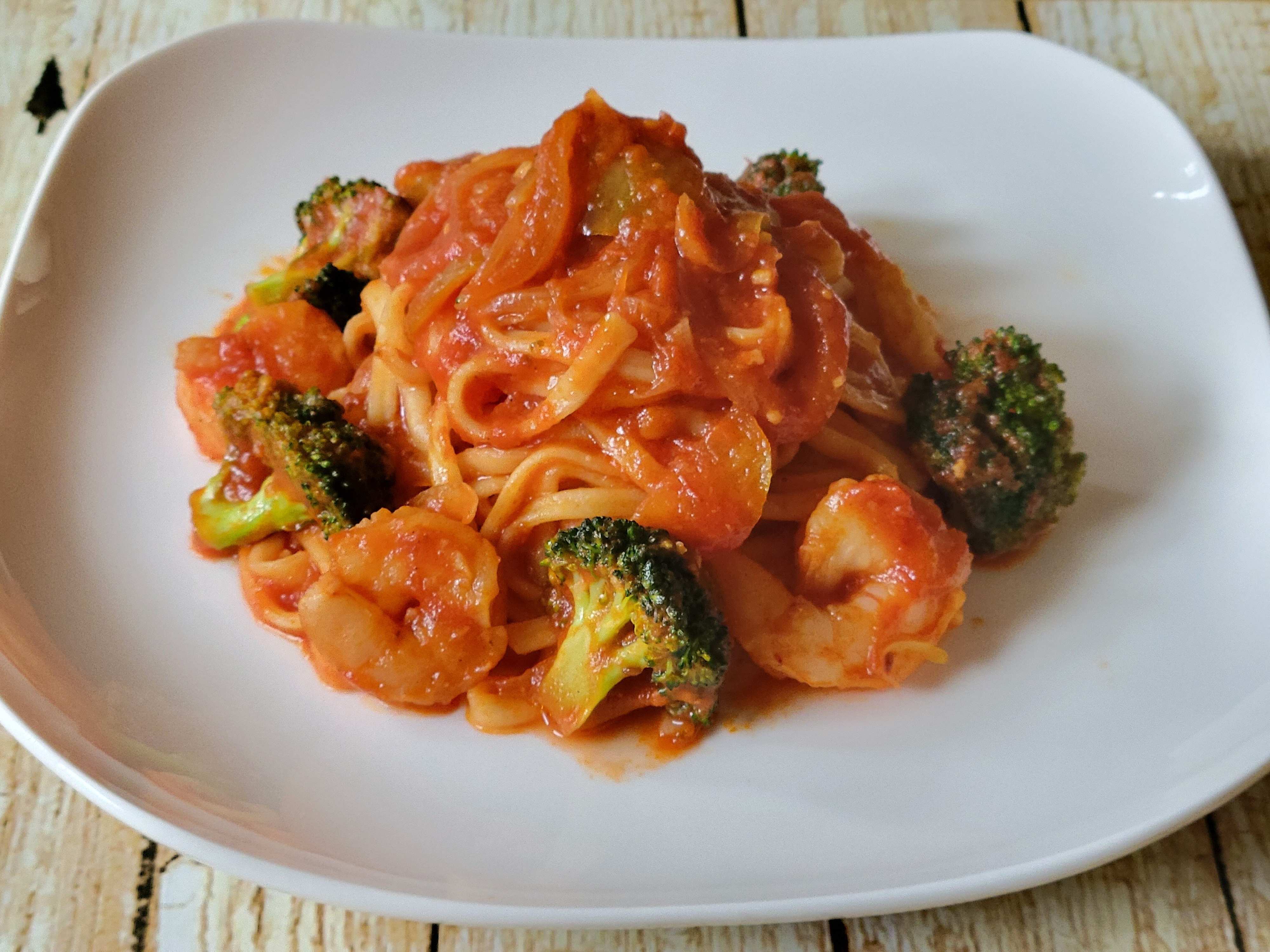 写真は海老とブロッコリーを入れたトマトソースと絡めたものです。モチモチのリングイネにソースがよく絡みます。