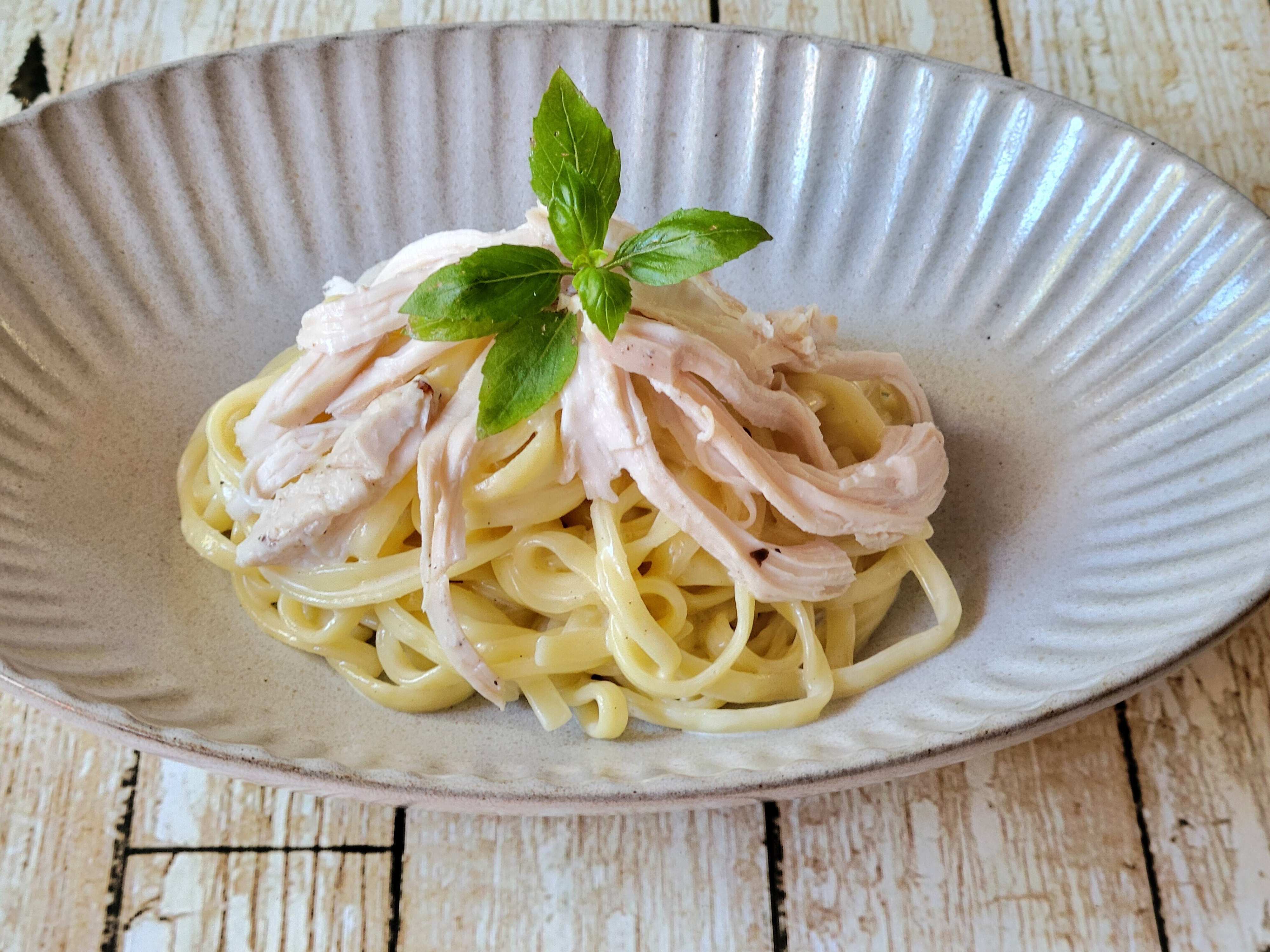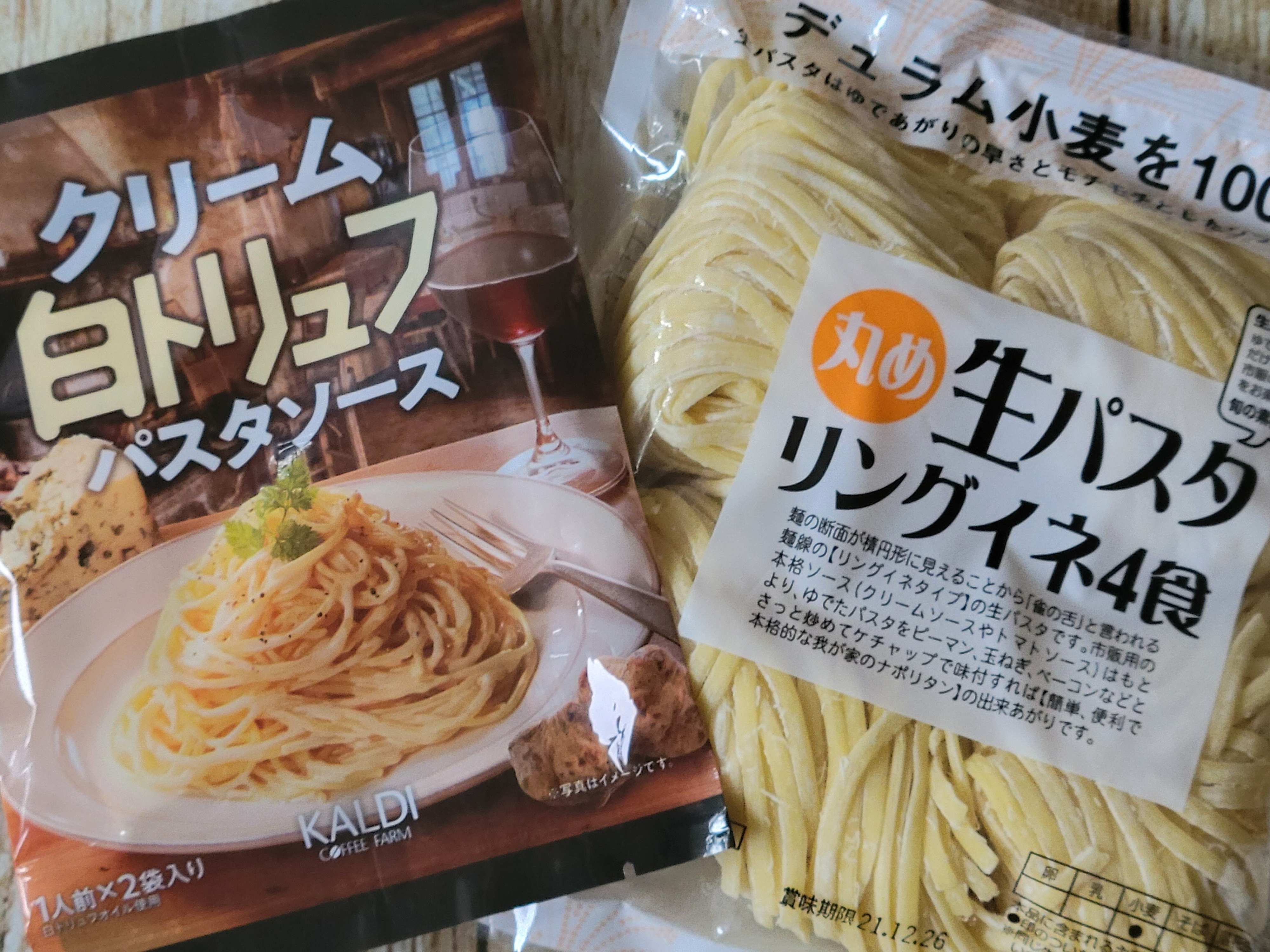 写真はカルディのクリーム白トリュフパスタソース(2食分入って198円)を絡めてサラダチキンをのせたものです。その他、クリーム系のパスタソースはどれもパスタによく絡むので、短時間でひとりランチができおすすめです。