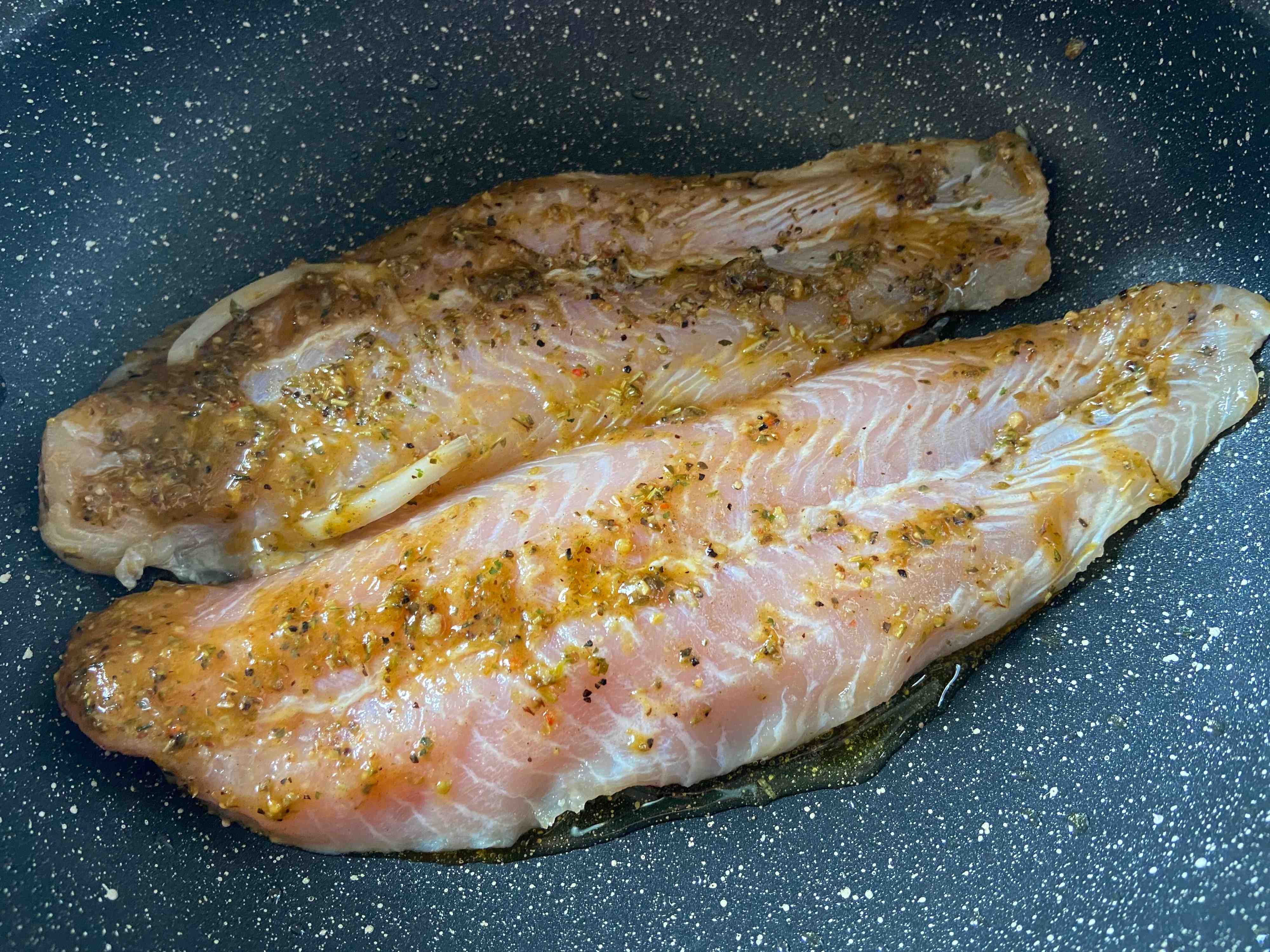 まずフライパンにオリーブオイルを入れ、にんにくを炒めます。いったん取りだしてパンガシウスを両面焼きます。