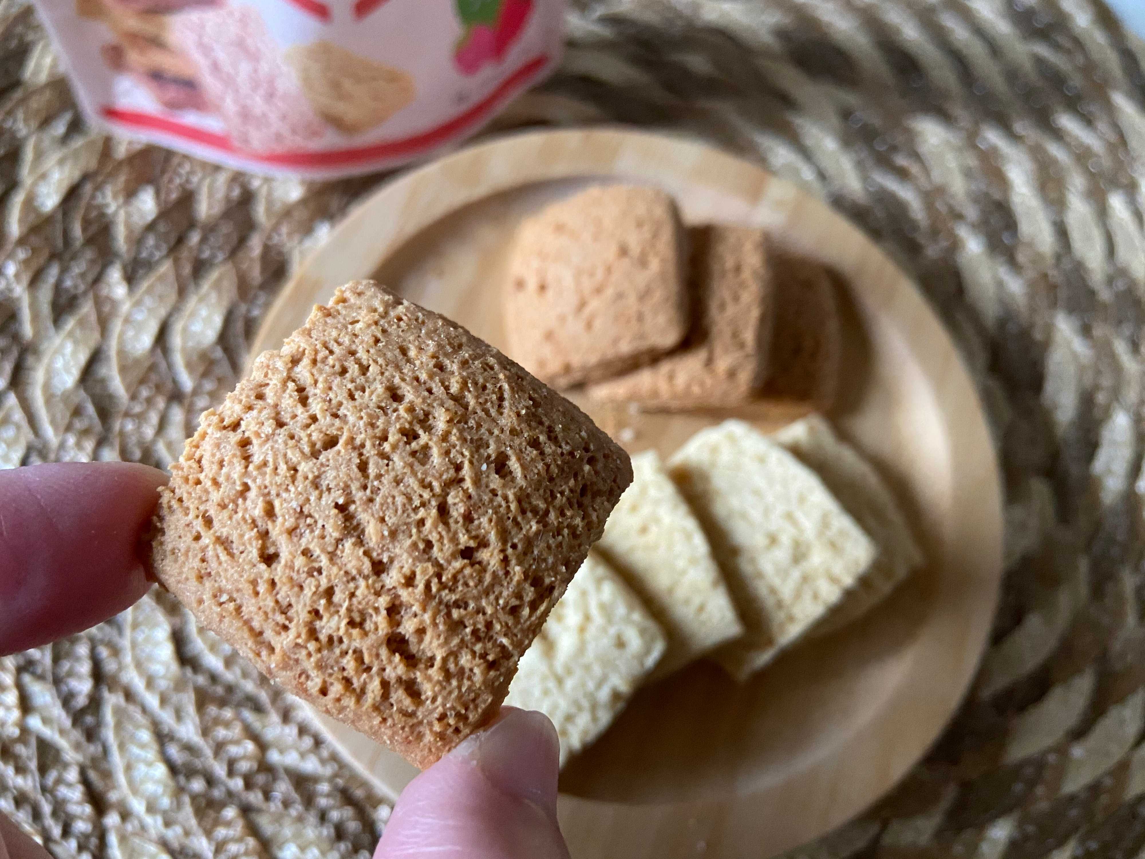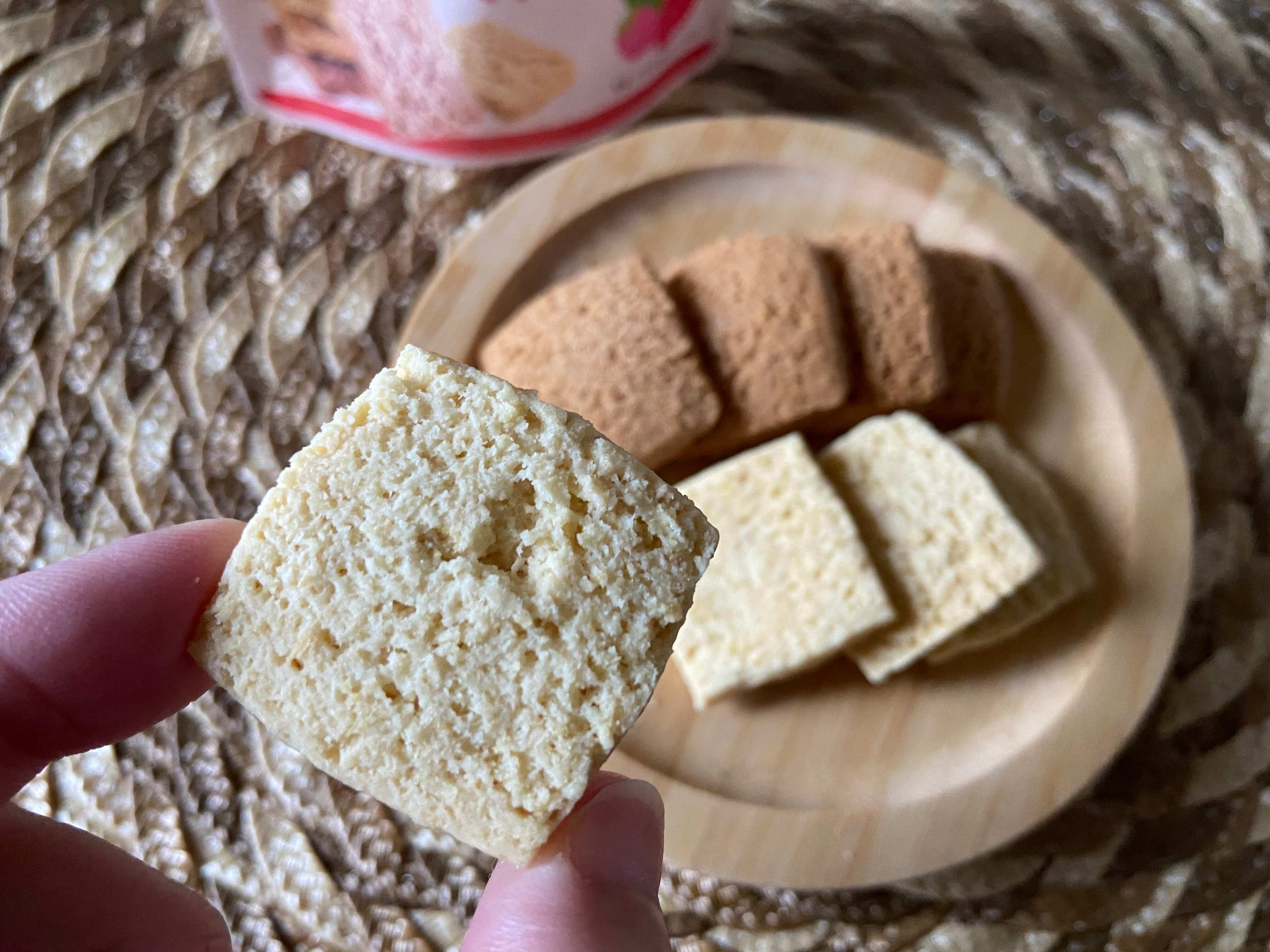 次はいちご味です。いちごパウダーが練り込まれていてほんのり甘酸っぱい香りがします。食感はプレーンと同じくザクザク系。おからの風味もしっかりあるし、いちごの存在感もあります。噛めば噛むほどやさしい甘さが出てきて、とってもおいしいです。