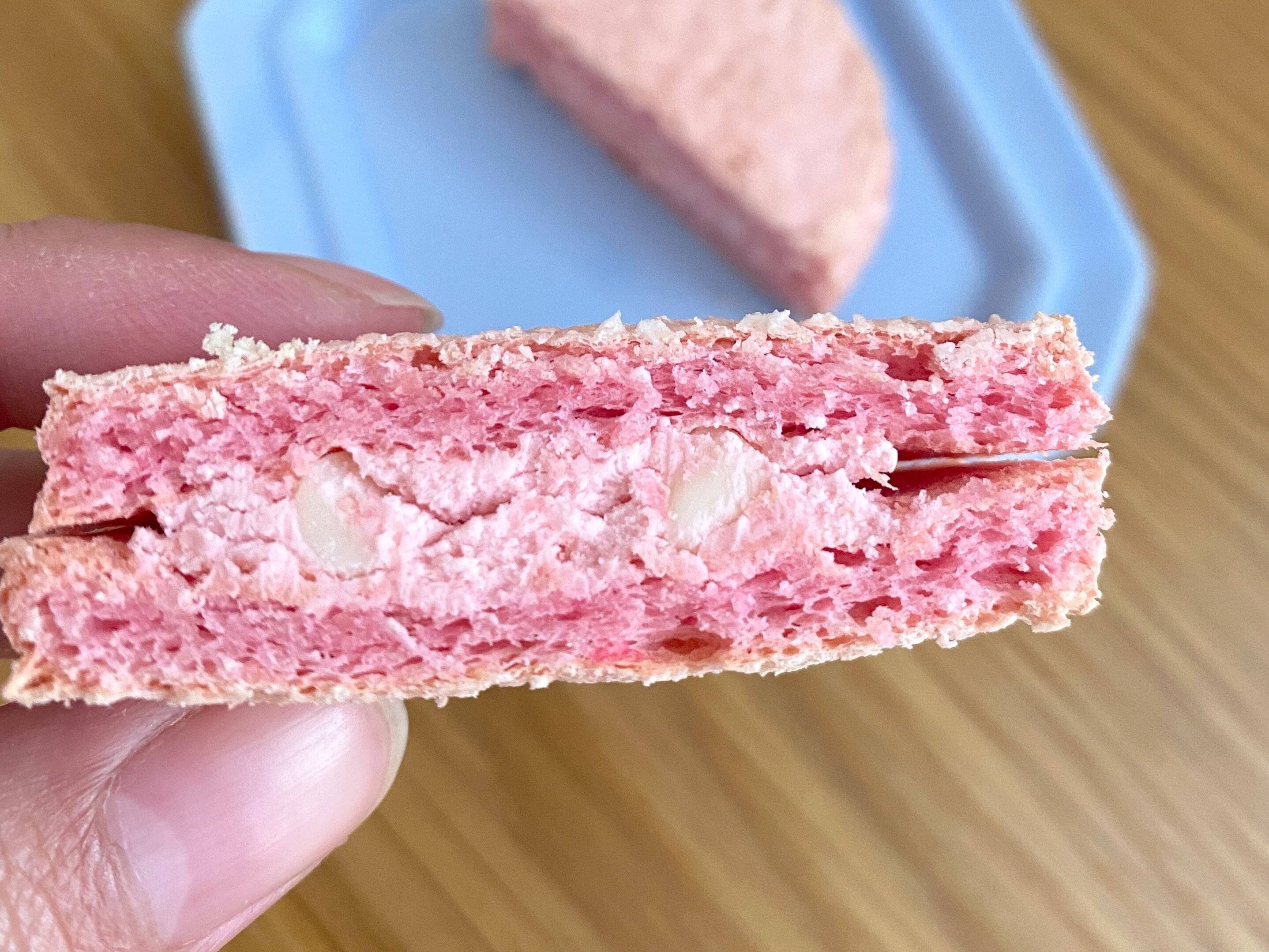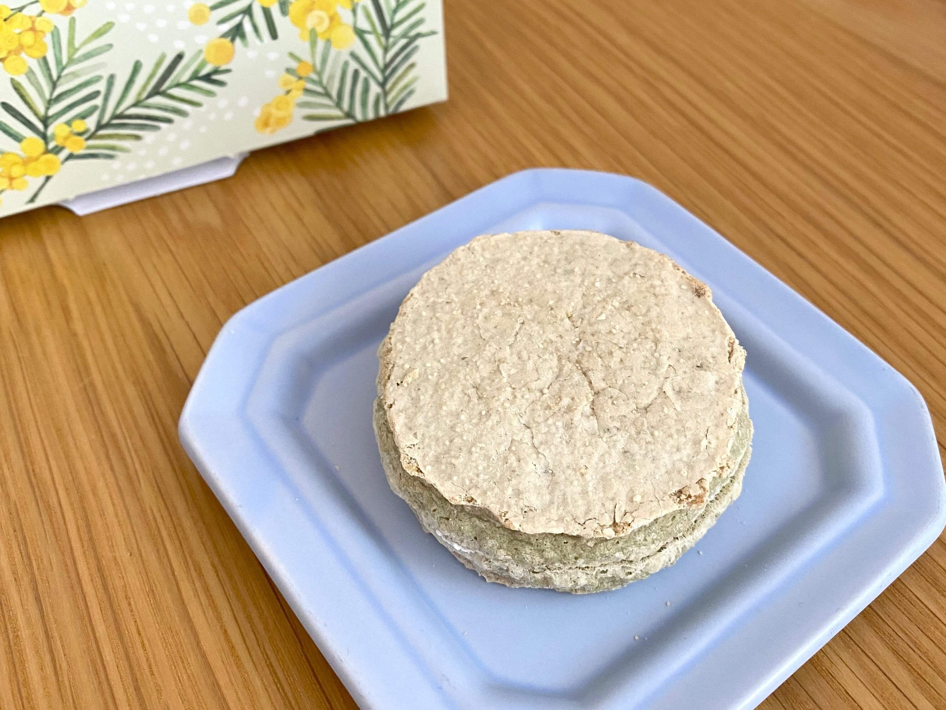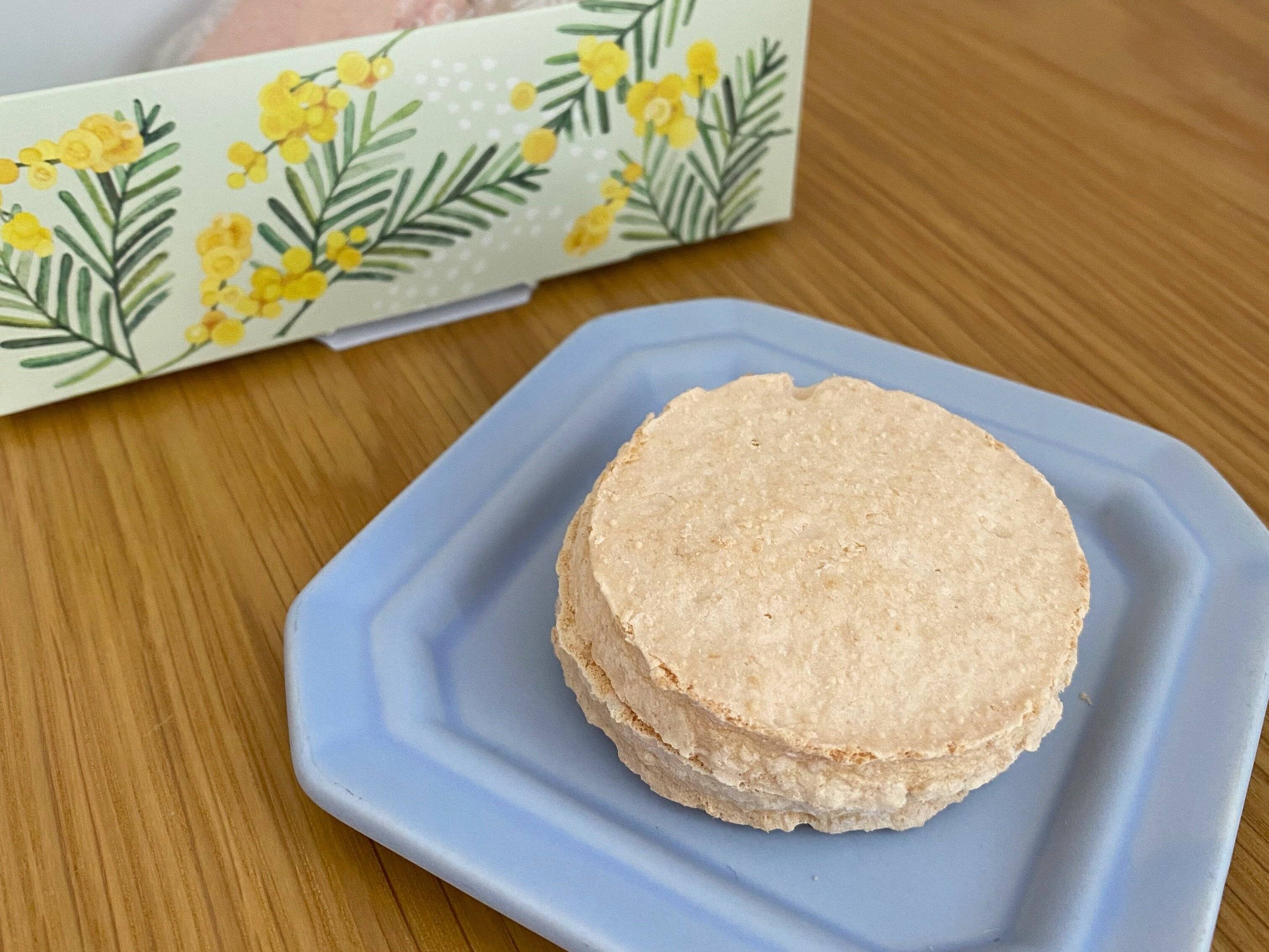ホワイトチョコと苺クリームの甘さとシンプルな生地がよく合っています。かためのホワイトチョコのボリボリ食感がアクセントになっていて面白い。3つの中で1番甘いダックワーズです。
