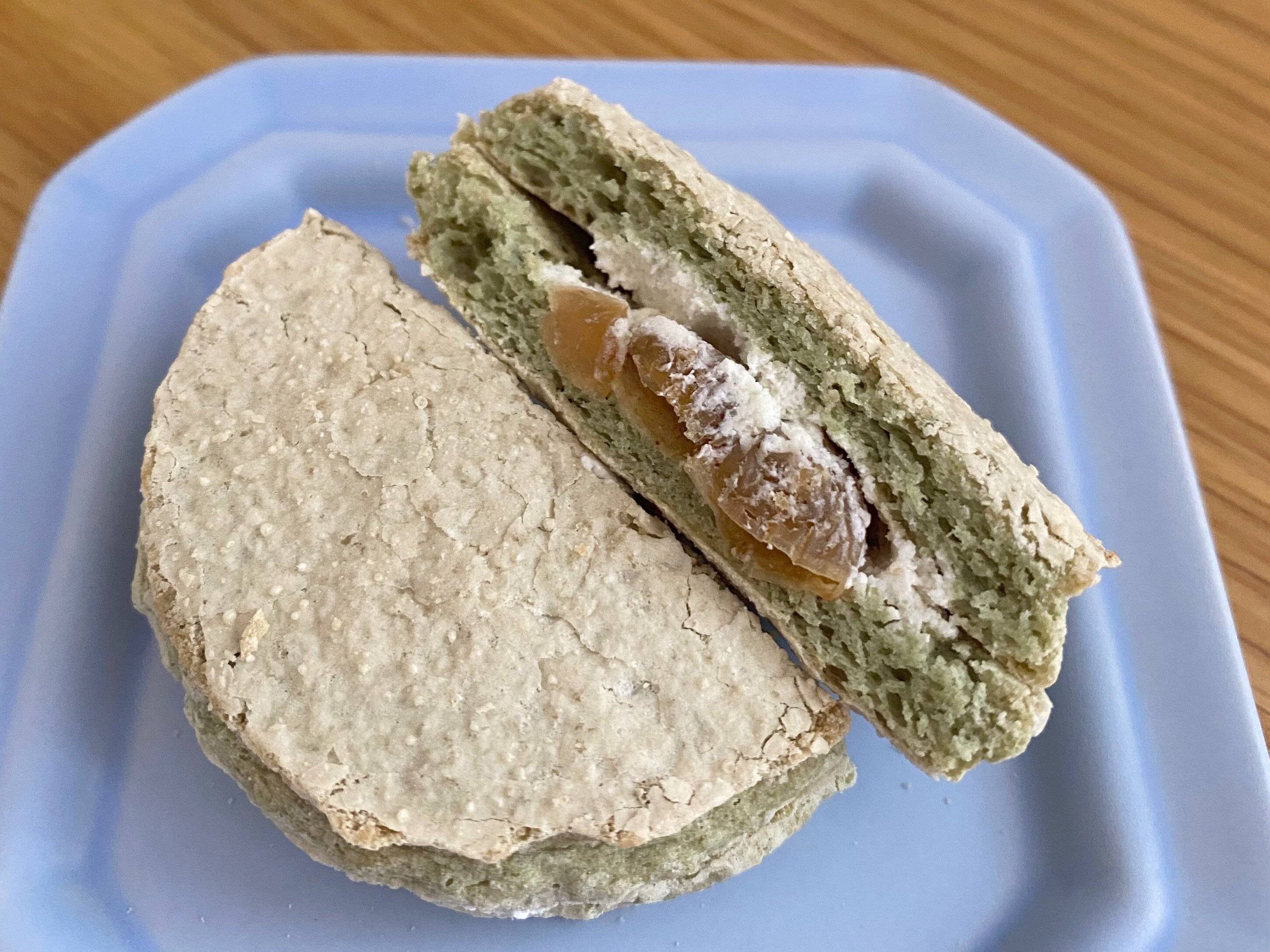 サクふわのダックワーズ生地でマスカットレーズンとクリームがサンドされています。1個あたりのカロリーは104kcal。