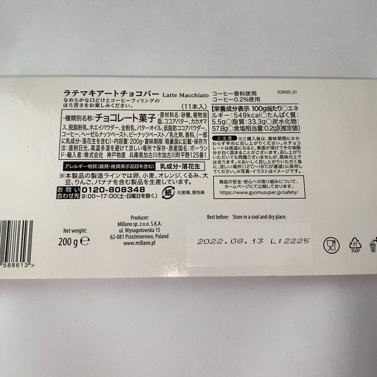 原材料名:砂糖、食物油脂、ココアバター、カカオマス、脱脂粉乳、ホエイパウダー、全粉乳、バターオイル、低脂肪ココアパウダー、コーヒー、ヘーゼルナッツペースト、ピーナッツペースト/乳化剤、香料(一部に乳成分・落花生を含む)