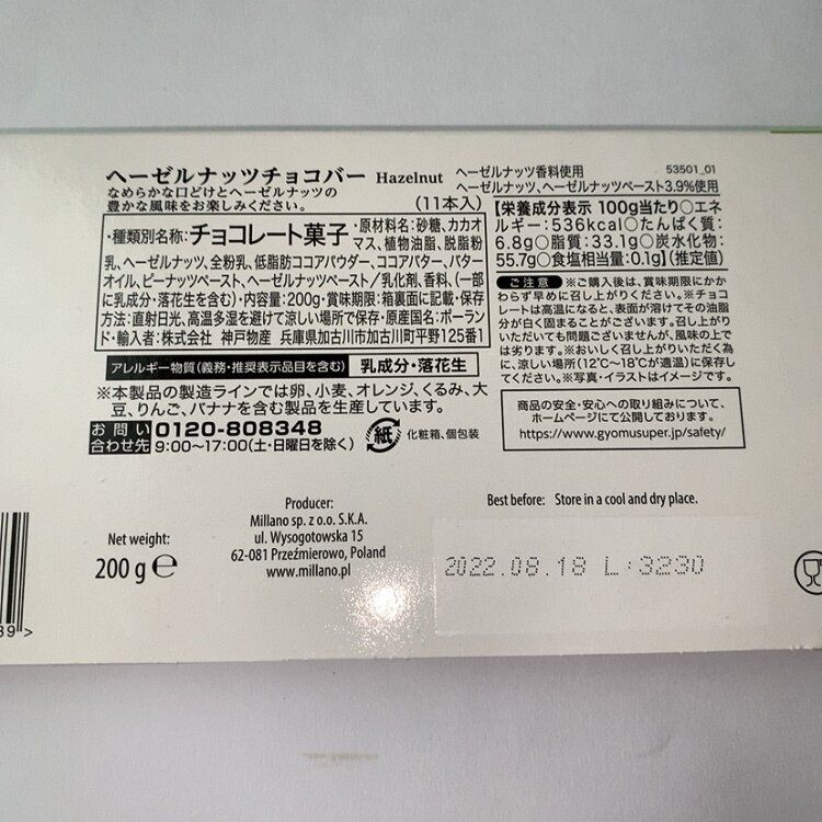 原材料名:砂糖、カカオマス、食物油脂、脱脂粉乳、ヘーゼルナッツ、全粉乳、低脂肪カカオパウダー、ココアパウダー、バターオイル、ピーナッツペースト、ヘーゼルナッツペースト/乳化剤、香料(一部に乳成分・落花生を含む)