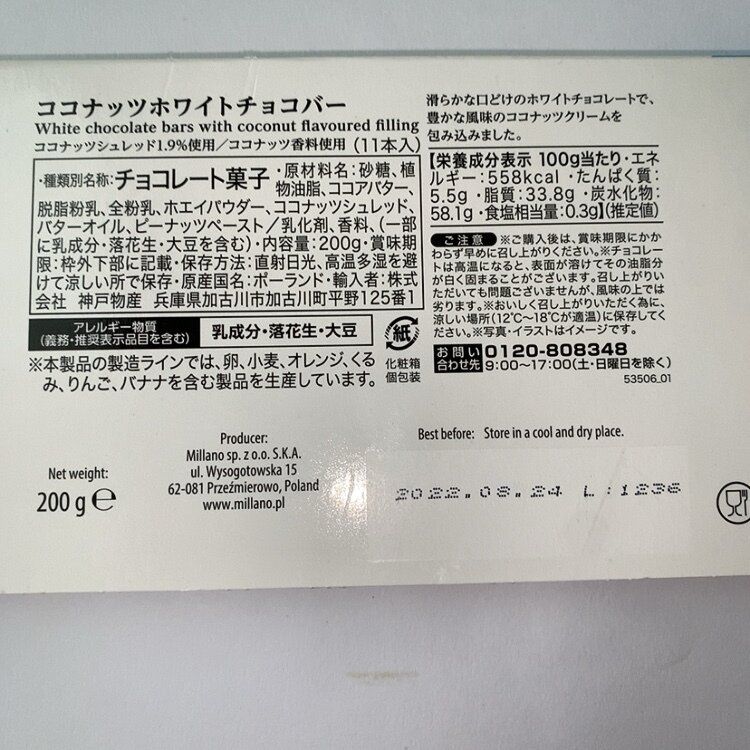 原材料名:砂糖、食物油脂、ココアバター、脱脂粉乳、全粉乳、ホエイパウダー、ココナッツシュレッド、バターオイル、ピーナッツペースト/乳化剤、香料(一部に乳成分・落花生を含む)